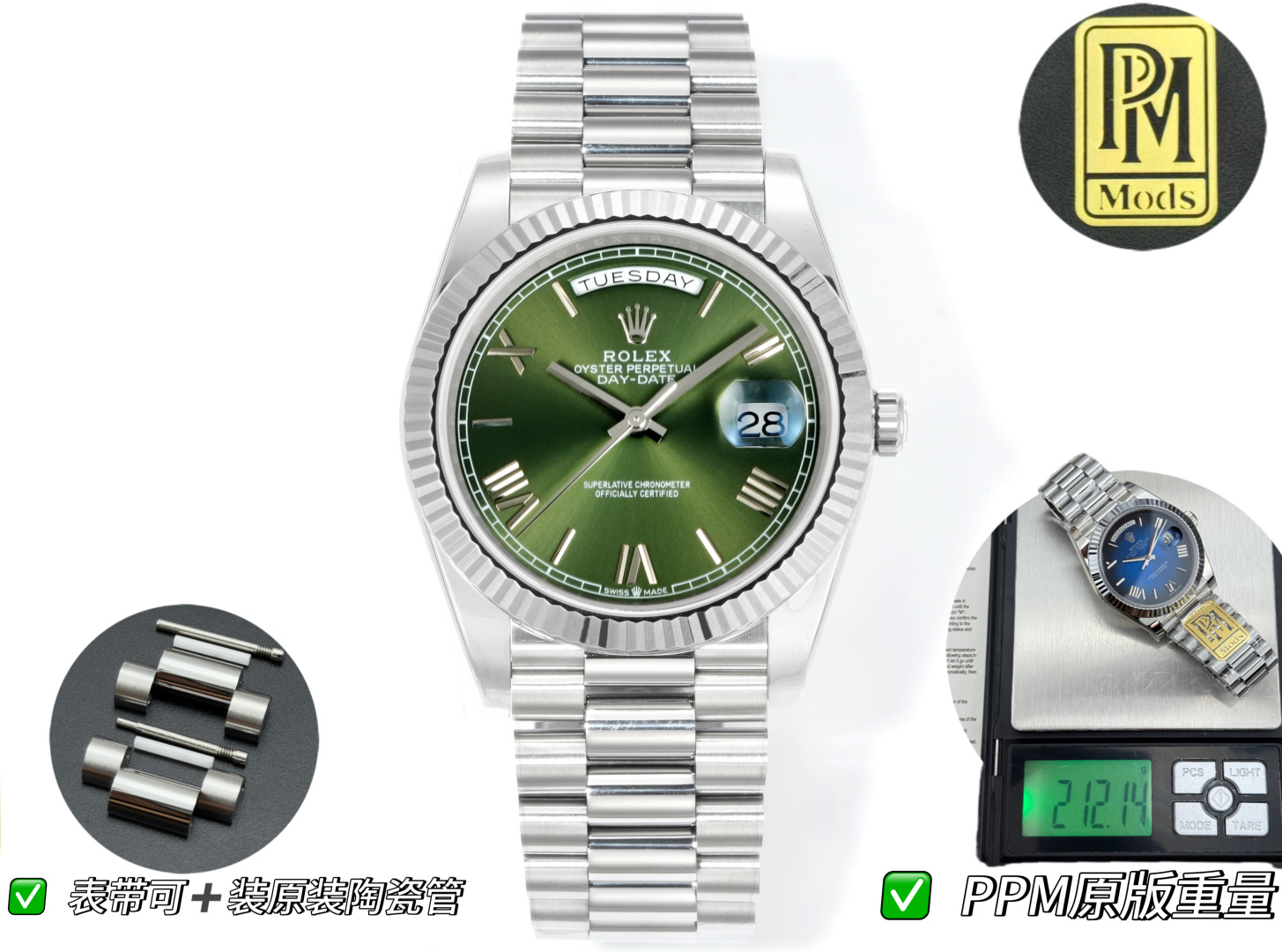 PPM Mods Weighted DD – Ceiling-Level ‘Rolex DD Day-Date’ PPM’s replica redefines the weighted DD version, meticulously replicating every detail from genuine original molds—be it bracelet color, dial hue, watch weight, or thickness. The bracelet incorporates ceramic tubes compatible with authentic models. This is no compromise replica; it represents a comprehensive leap in materials and craftsmanship!Rejecting “market-grade” imitations, every gram of weight (precise 209g-212g) and every millimeter of thickness fights for the dignity of the original.