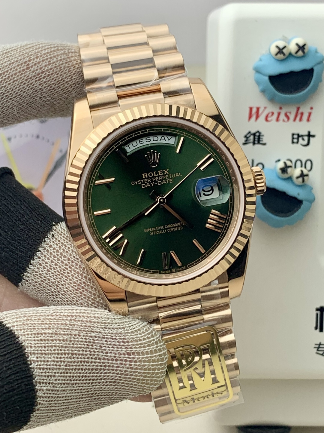 PPM Mods Weighted DD – Ceiling-Level ‘Rolex DD Day-Date’ PPM’s replica redefines the weighted DD version, featuring genuine original molds for strap color, dial color, watch weight, and thickness. The strap incorporates ceramic tubes compatible with authentic models—this is no compromise replica, but a comprehensive leap in materials and craftsmanship!Rejecting “market-grade” imitations, every gram of weight (precise 209g-212g) and every millimeter of thickness fights for the dignity of the original.