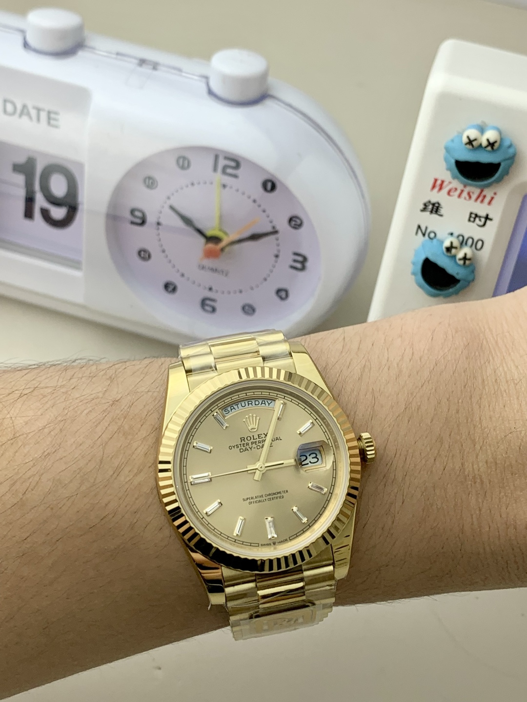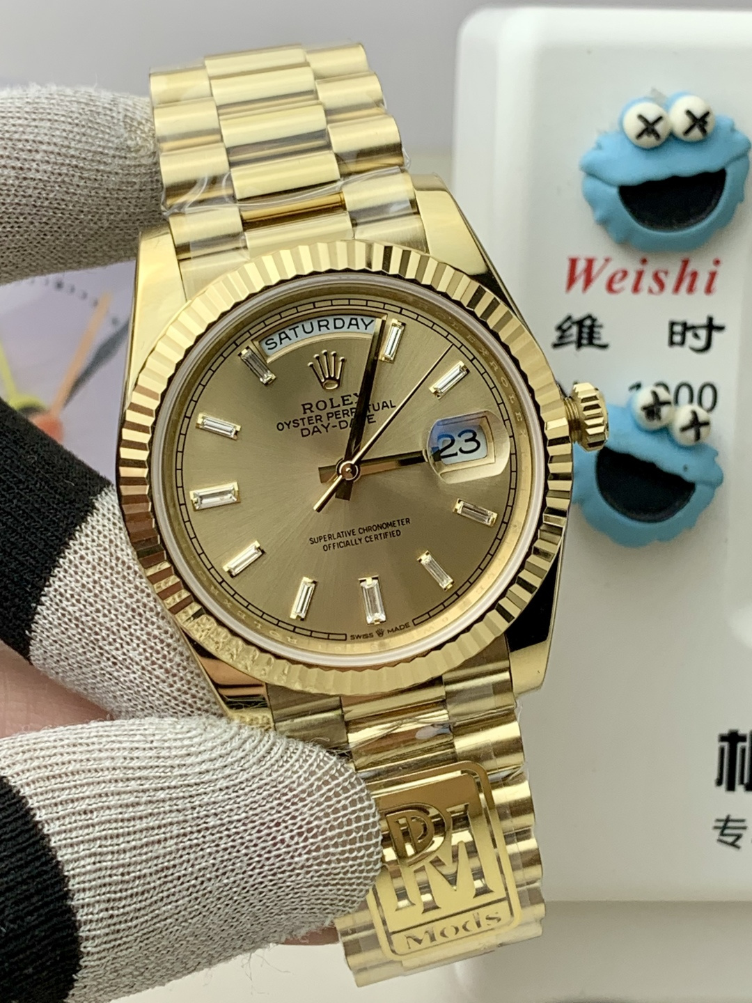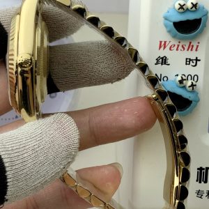 PPM Mods Weighted DD – Ceiling-Level ‘Rolex DD Day-Date’ PPM’s replica redefines the weighted DD version, featuring genuine original molds for strap color, dial color, watch weight, and thickness. The strap incorporates ceramic tubes compatible with authentic models—this is not a compromised replica, but a comprehensive surpassing of materials and craftsmanship!Rejecting “market-grade” knockoffs, every gram of weight (precise 209g-212g) and every millimeter of thickness fights for the dignity of the original. Bracelet: Authentic 3mm thickness Weight: Approx. 107g (non-extended) 🈚 Ceramic tube version ±1-2g.Case: Original thickness: 12.3mm (non-thickened) Weight: Original 3255: 102g; Optional 2836: ±1g. Full series total weight: 209g-212g. ⚠️”Excludes diamond-bezel models.” Authentic thickness achieved through monolithic forging of high-density aerospace-grade military alloy, hardness rivaling 18K gold!Exclusive vacuum ion-plated gold technology delivers a luster infinitely close to 18K gold’s unique warm texture, offering scratch resistance and durability. Precisely replicates every link’s shape, thickness, and curvature of the genuine strap. Dial: Features original three-dimensional ink, matching the top-tier dial craftsmanship of the factory. Sharp hands, full hour markers, and uniform luminescence.Movement options: Premium Edition 2836 or 3255 integrated movement (±72-hour power reserve) available for your selection!