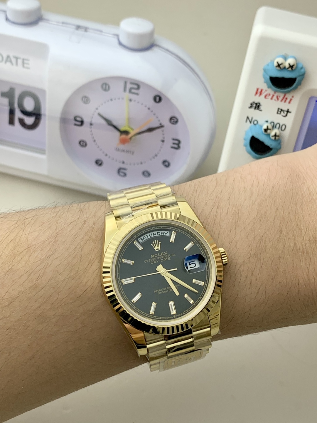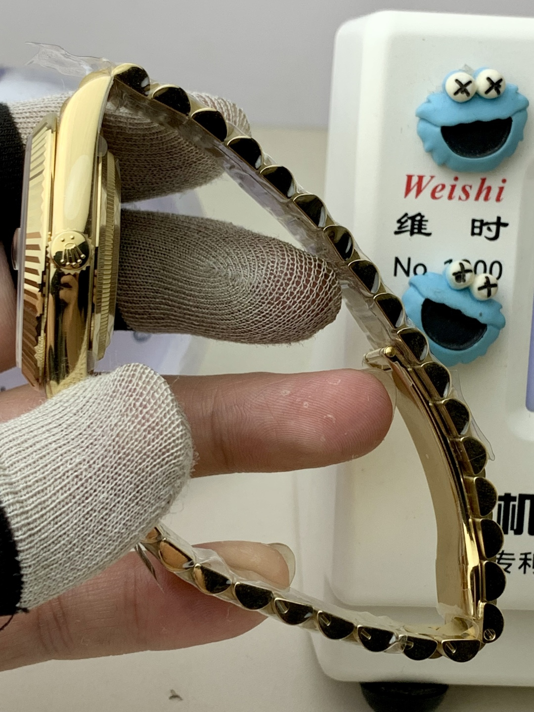 PPM Mods Weighted DD – Ceiling-Level ‘Rolex DD Day-Date’ PPM’s replica redefines the weighted DD version, featuring genuine original molds for strap color, dial color, watch weight, and thickness. The strap incorporates ceramic tubes compatible with authentic models—this is not a compromised replica, but a comprehensive leap in materials and craftsmanship!Rejecting “market-grade” imitations, every gram of weight (precise 209g-212g) and every millimeter of thickness fights for the dignity of the original. Bracelet: Authentic 3mm thickness Weight: Approx. 107g (non-extended) 🈚 Ceramic tube version ±1-2g.Case: Original thickness: 12.3mm (non-thickened) Weight: Original 3255: 102g; Optional 2836: ±1g. Full series total weight: 209g-212g. ⚠️”Excludes diamond bezel models.” Authentic thickness achieved through monolithic forging of high-density aerospace-grade military alloy, hardness rivaling 18K gold!Exclusive vacuum ion-plated gold technology delivers a luster infinitely close to 18K gold’s signature warm texture, offering scratch resistance and durability. Precisely replicates every link’s form, thickness, and curvature of the genuine strap. Dial: Features original-grade raised ink, matching the top-tier dial craftsmanship of the factory. Sharp hands, full hour markers, and uniform luminescence.Movement options: Premium Edition 2836 or 3255 integrated movement (±72-hour power reserve) available for your selection!