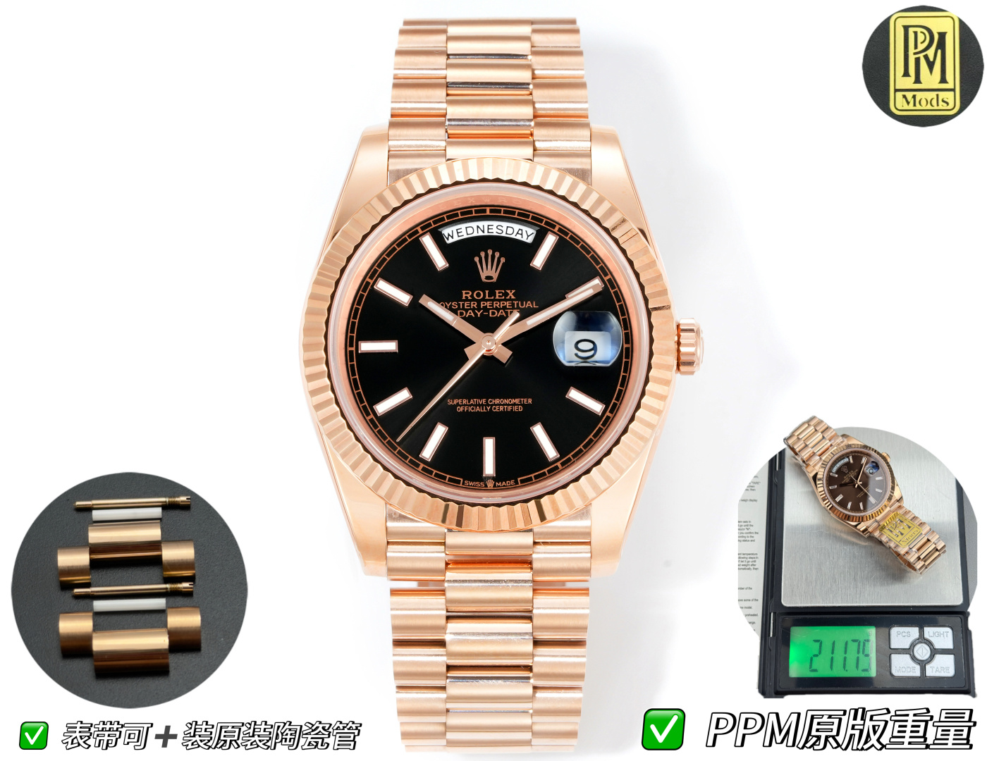 PPM Mods Weighted DD – Ceiling-Level ‘Rolex DD Day-Date’ PPM’s replica redefines the weighted DD version, featuring genuine original molds for strap color, dial color, watch weight, and thickness. The strap incorporates ceramic tubes compatible with authentic models—this is not a compromised replica, but a comprehensive leap in materials and craftsmanship!Rejecting “market-grade” imitations, every gram of weight (precise 209g-212g) and every millimeter of thickness fights for the dignity of the original.
