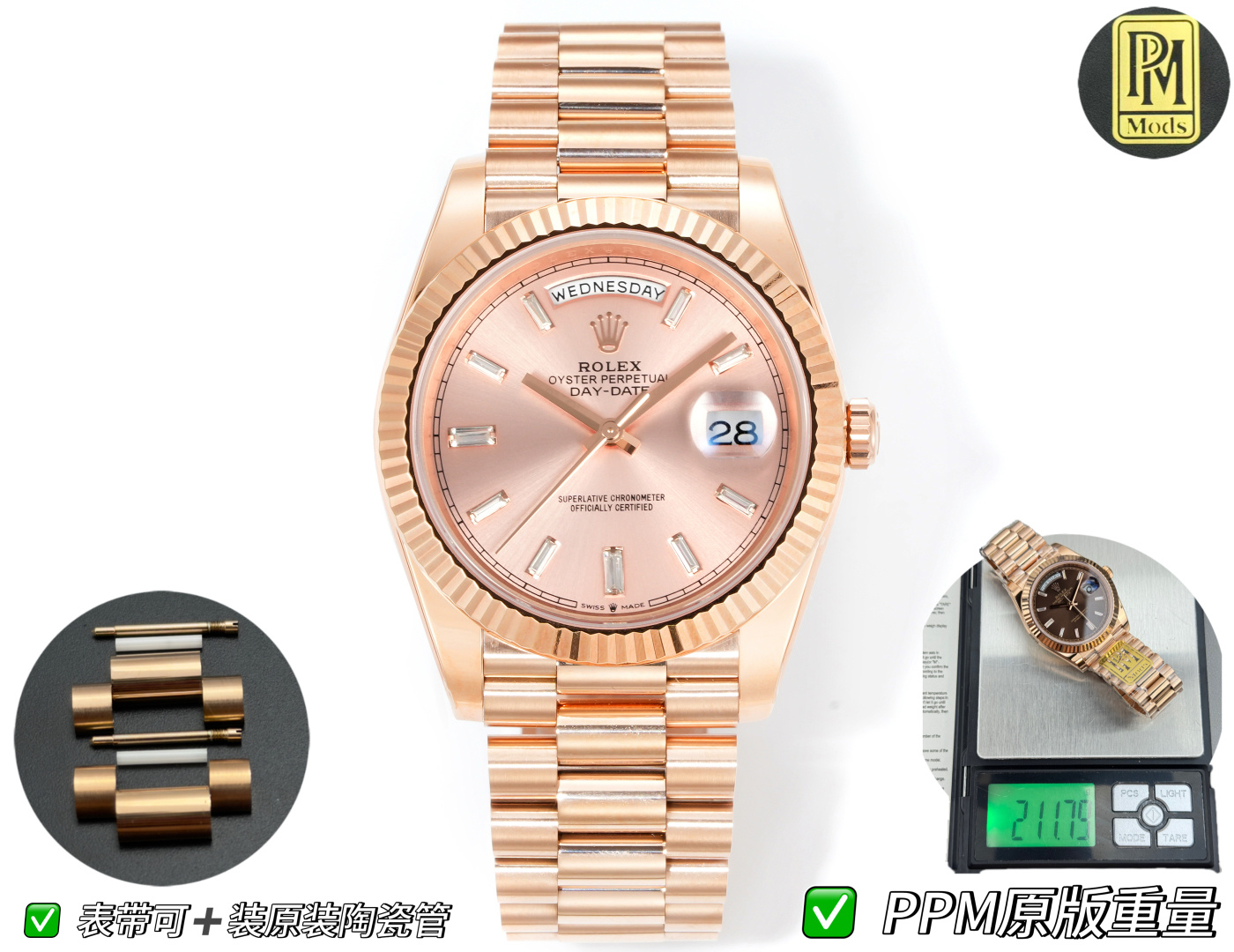 PPM Mods Weighted DD – Ceiling-Level ‘Rolex DD Day-Date’ PPM’s replica redefines the weighted DD version, meticulously replicating every detail from genuine original molds—be it bracelet color, dial hue, watch weight, or thickness. The bracelet incorporates ceramic tubes compatible with authentic models. This is no compromise replica; it represents a comprehensive leap in materials and craftsmanship!Rejecting “market-grade” imitations, every gram of weight (precise 209g-212g) and every millimeter of thickness fights for the dignity of the original.