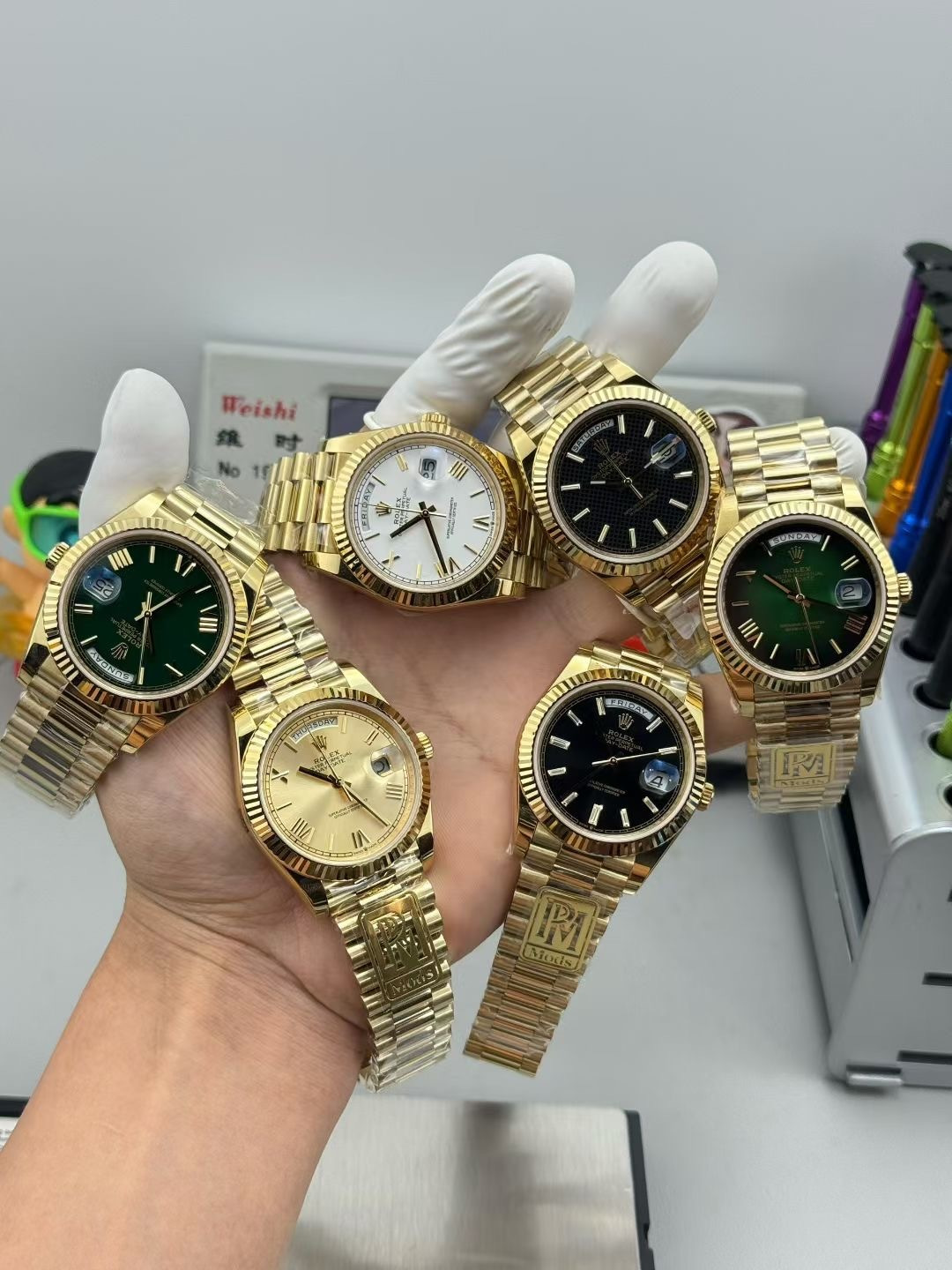 PPM Mods Weighted DD – Ceiling-Level ‘Rolex DD Day-Date’ PPM’s replica redefines the weighted DD version, featuring genuine original molds for strap color, dial color, watch weight, and thickness. The strap incorporates ceramic tubes compatible with authentic models—this is not a compromised replica, but a comprehensive leap in materials and craftsmanship!Rejecting “market-grade” imitations, every gram of weight (precise 209g-212g) and every millimeter of thickness fights for the dignity of the original. Bracelet: Authentic 3mm thickness Weight: Approx. 107g (non-extended) 🈚 Ceramic tube version ±1-2g.Case: Original thickness: 12.3mm (non-thickened) Weight: Original 3255: 102g; Optional 2836: ±1g. Full series total weight: 209g-212g. ⚠️”Excludes diamond-set bezel models.” Authentic thickness achieved through monolithic forging of high-density aerospace-grade military alloy, hardness rivaling 18K gold!Exclusive vacuum ion-plated gold technology delivers a luster infinitely close to 18K gold’s signature warm texture, offering scratch resistance and durability. Precisely replicates every link’s form, thickness, and curvature of the genuine strap. Dial: Features original-grade raised ink, matching the top-tier dial craftsmanship of the factory. Sharp hands, full hour markers, and uniform luminescence.Movement options: Premium Edition 2836 or 3255 integrated movement (±72-hour power reserve) available for your selection!