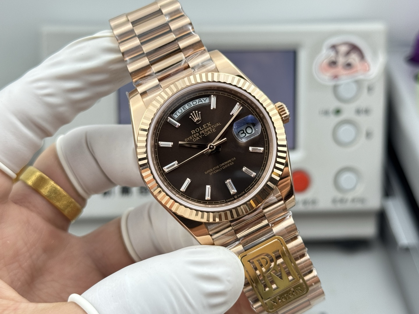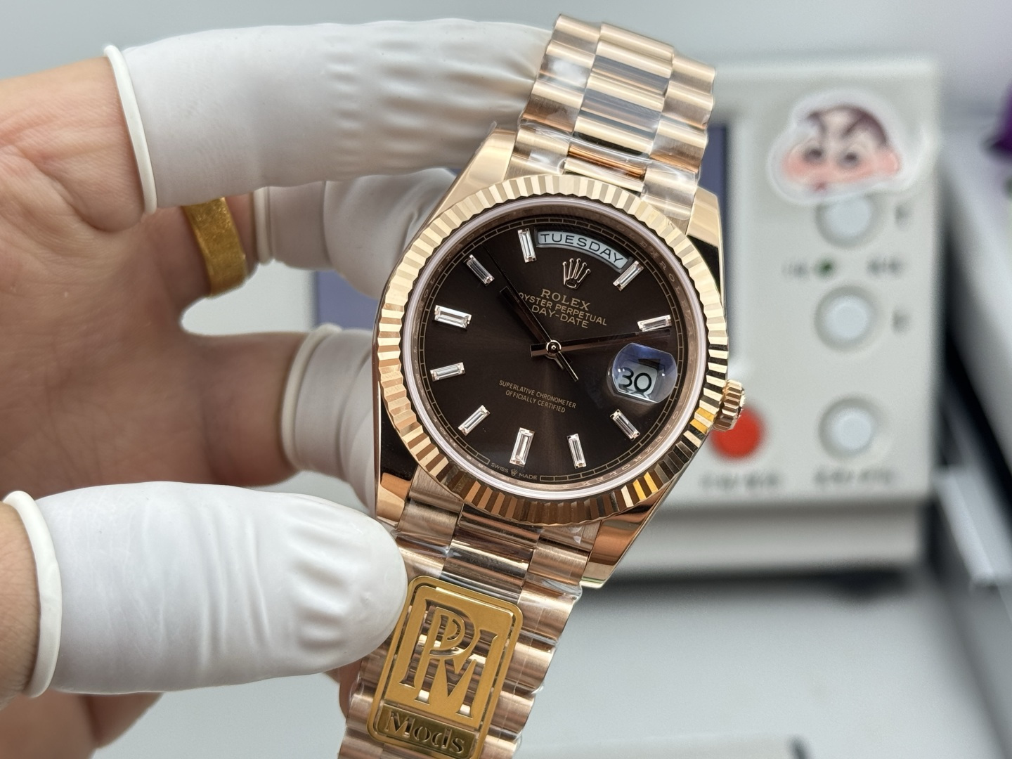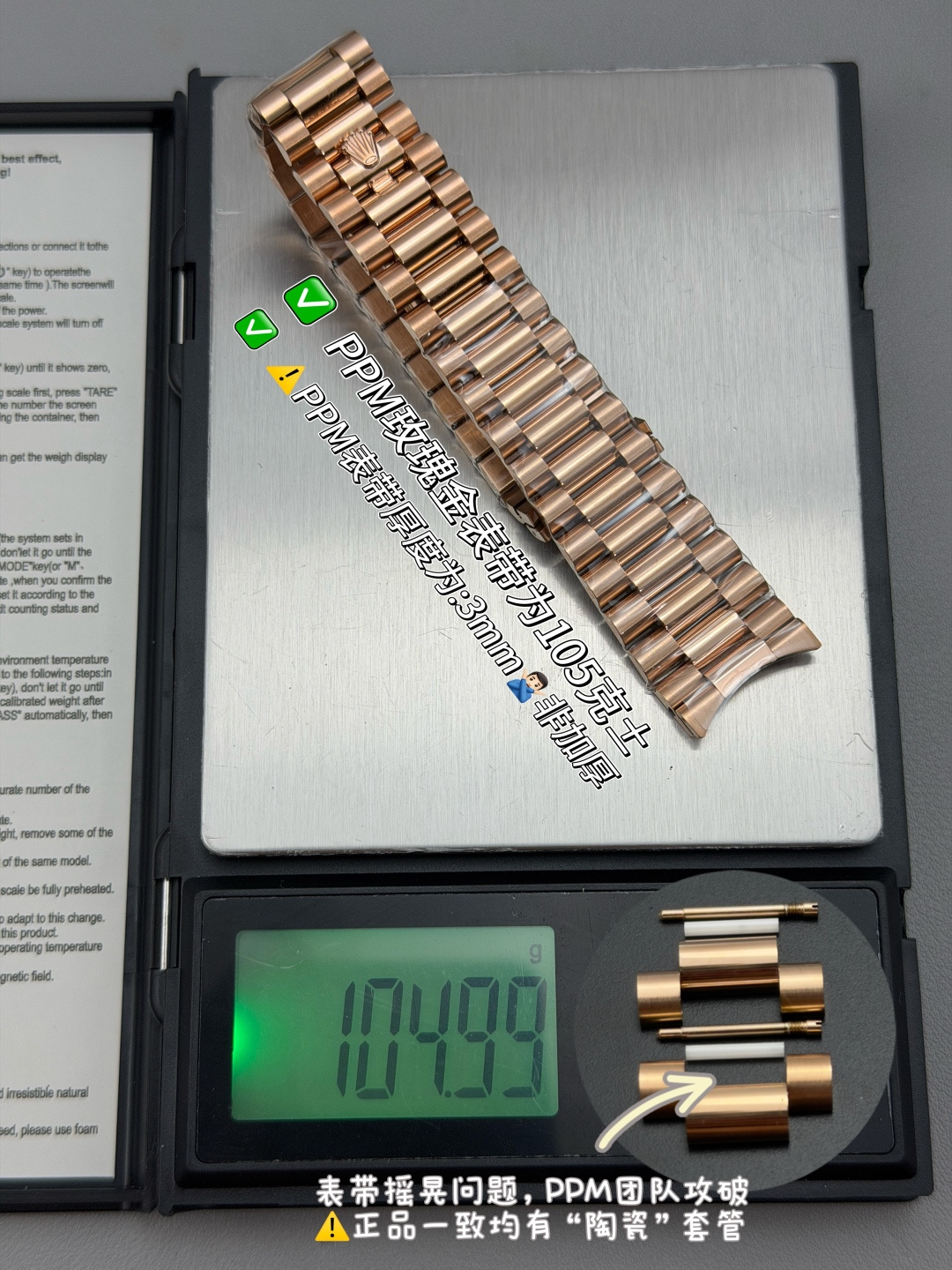 PPM Mods Weighted DD – Ceiling-Level ‘Rolex DD Day-Date’ PPM’s replica redefines the weighted DD version, featuring genuine original molds for strap color, dial color, watch weight, and thickness. The strap incorporates ceramic tubes compatible with authentic models—this is not a compromised replica, but a comprehensive surpassing of materials and craftsmanship!Rejecting “market-grade” imitations, every gram of weight (precise 209g-212g) and every millimeter of thickness fights for the dignity of the original.