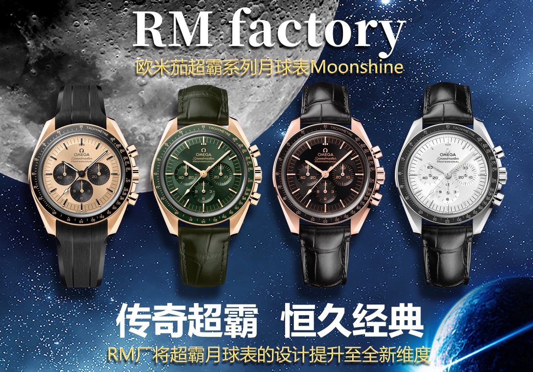 RM unleashes its ultimate move—the “Yu Wenba” is here! The 2022 Legendary Space Watch—Omega Speedmaster Moonwatch Moonshine 18K Gold Edition. The 42mm case is crafted from Moonshine 18K gold, polished and brushed, drawing inspiration from the asymmetrical case of the fourth-generation Speedmaster worn on the moon.The arched minute hand and central chronograph seconds hand carry forward the iconic hand styling of the Speedmaster “Moonwatch.” The Moonshine 18K gold crown features an embossed brand emblem, while the chronograph pushers are also crafted from Moonshine 18K gold. The “stepped” dial, made of Moonshine 18K gold, showcases a sunray-brushed finish.The tachymeter scale on the ceramic bezel is crafted using OMEGA Ceragold technology and features the “Dot Over Ninety” (DON) emblem from early Speedmaster models, where the dot above the 90 mark is positioned above the numeral.The outer ring of the transparent caseback is also crafted from polished Moonshine 18K gold, featuring a double-beveled design and engraved with “THE FIRST WATCH WORN ON THE MOON” and “CO-AXIAL MASTER CHRONOMETER.”Through the flat sapphire crystal caseback, the intricate workings of the 3861 Co-Axial Master Chronometer movement can be admired. Another exquisite masterpiece from RM Factory—welcome to appreciate!