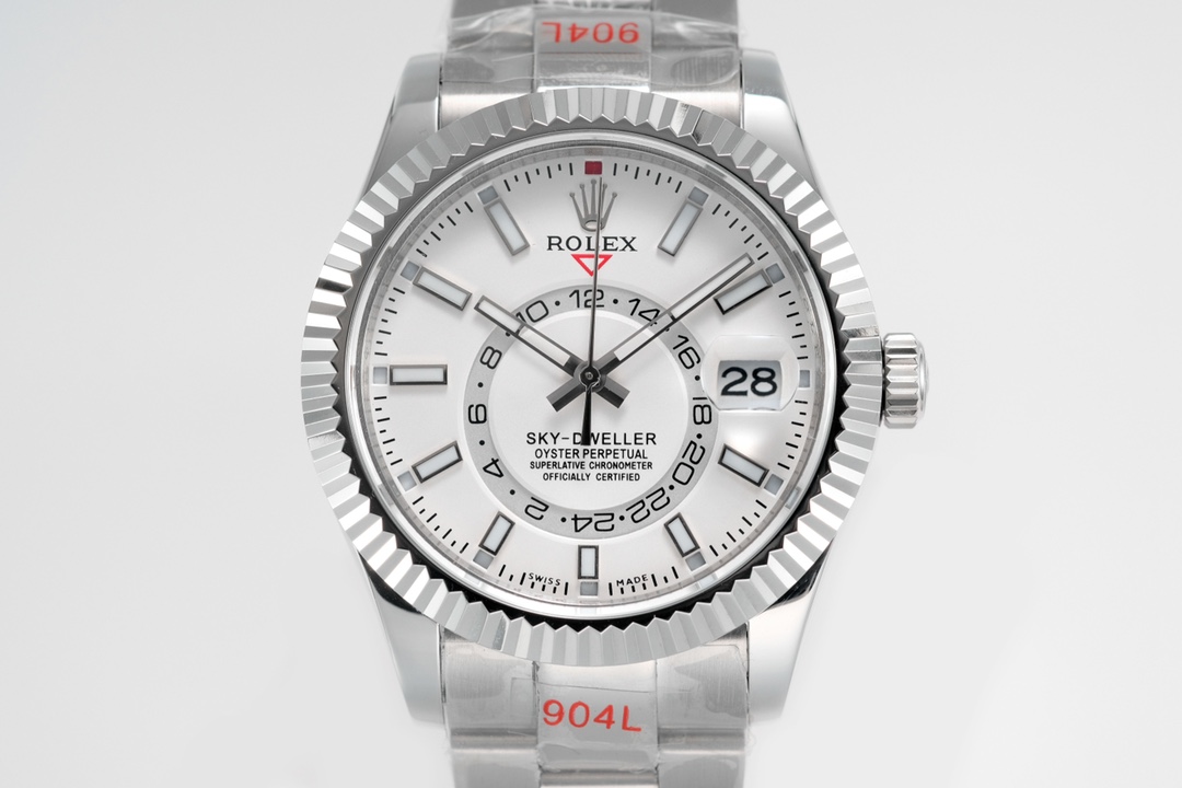 Rolex Sky-Dweller! [Case] 42MM diameter, steadfast and reliable, exuding elegance and grandeur! Bezel features Rolex Ring Command triangular grooves, with a rotating outer ring to adjust the month function!Scratch-resistant sapphire crystal with anti-reflective coating and convex magnified date window. [Bracelet]: Oystersteel, Oysterlock clasp with 5mm Easylink extension system. [Dial]: Sunburst finish with red dot at 12 o’clock for month indication. [Functions]: Date display, month display, annual calendar, dual time zone.