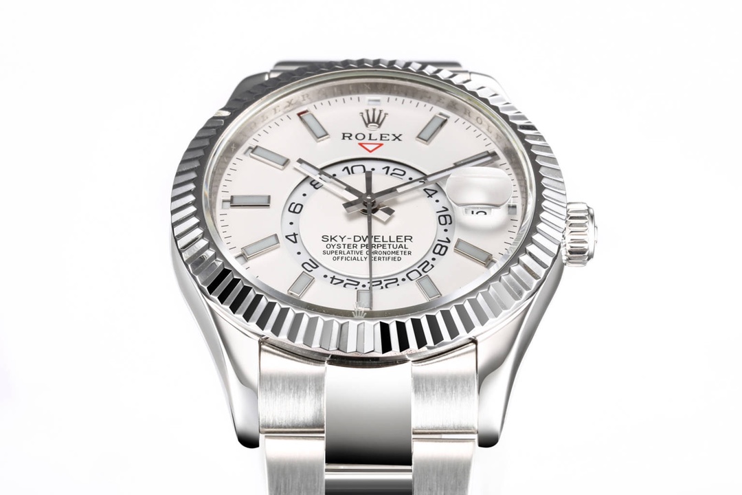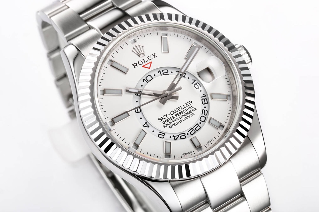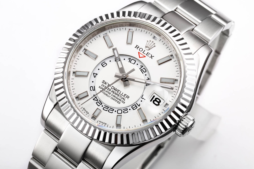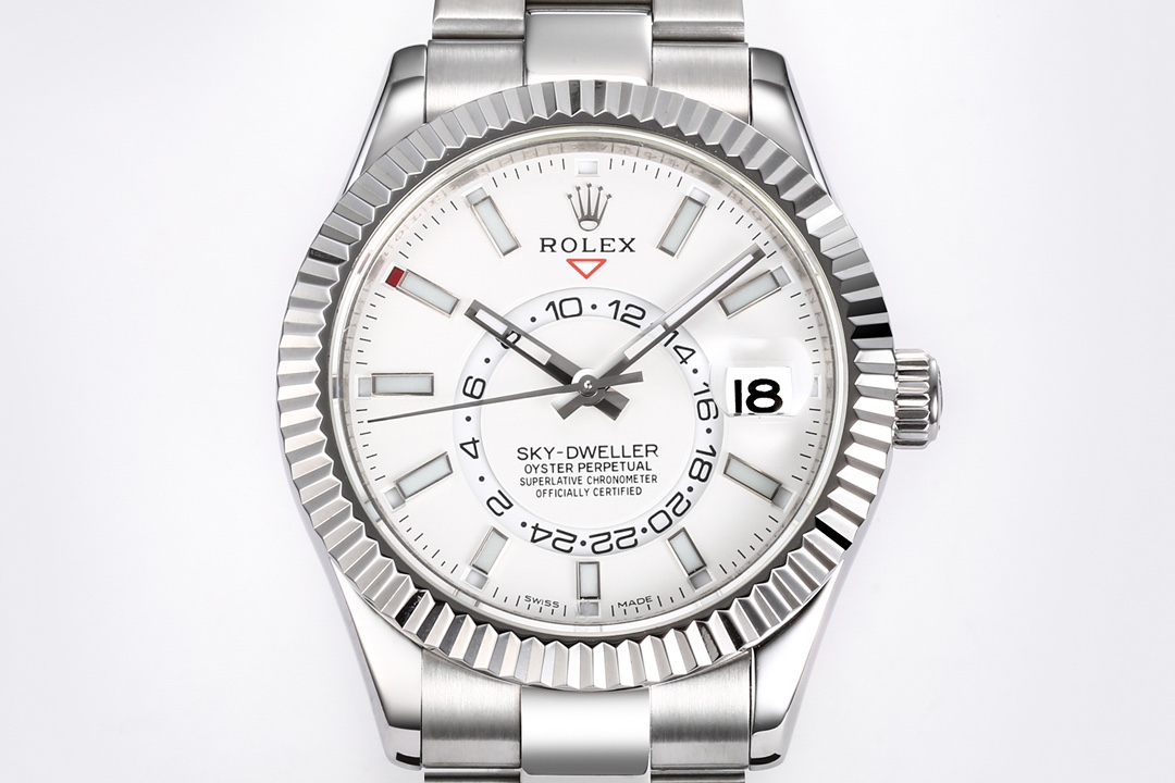 Rolex Sky-Dweller! Stunning Details: [Case] 42mm diameter, solid and reliable, elegant and generous! Bezel features Rolex Ring Command triangular grooves, rotating outer ring adjusts month function! Scratch-resistant sapphire crystal, anti-reflective convex magnified date window. [Bracelet] Oystersteel!Triple-link bracelet with Oysterlock clasp and 5mm Easylink extension system. Dial: Sunburst finish with red dot month indicator at 12 o’clock. Movement: Automatic mechanical 9001 caliber. Functions: Date display / Month display / Annual calendar / Dual time zone.