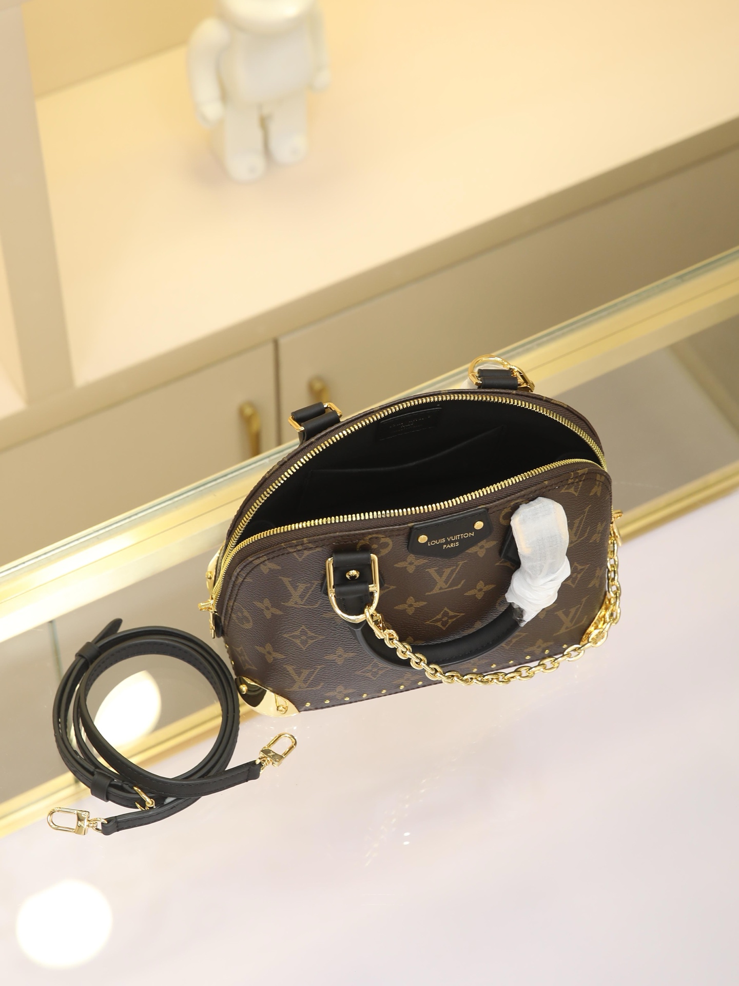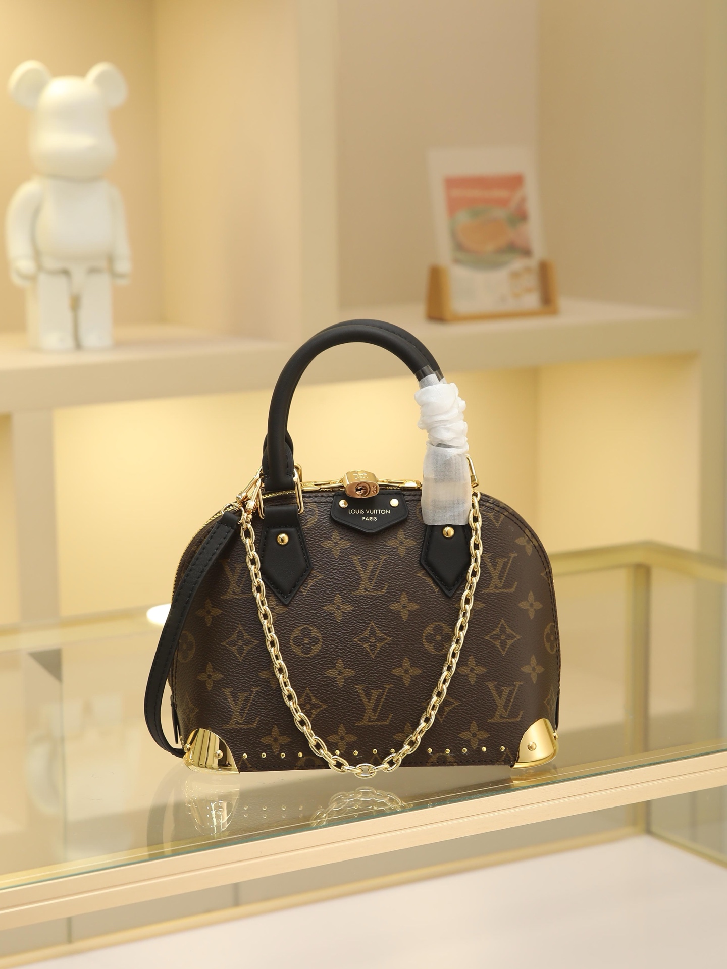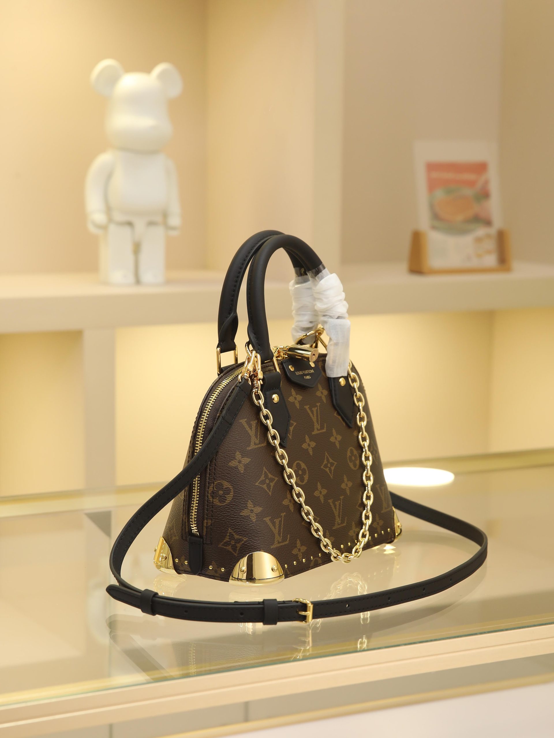 The Alma BB handbag has been reimagined as the newest addition to the Trunk collection, paying homage to the brand’s rich heritage of travel with its iconic signature. Crafted from Monogram canvas, it features deep leather trim accented by dazzling metal corners and studs. This version comes with a detachable chain that can be worn with the adjustable shoulder strap or separately.19 x 11 x 22 cm (H x W x L) Monogram coated canvas Cowhide leather trim Fabric lining Metal hardware Zip closure with padlock and key Interior pocket accommodates 6.7-inch smartphone, earphones, Rosalie coin purse, keys, and lipstick Shoulder strap:Removable, adjustable Strap half-length: 50.0 cm Strap half-length adjustable to: 66.0 cm Chain: Removable chain Half-length: 22.0 cm Handles: Double handles