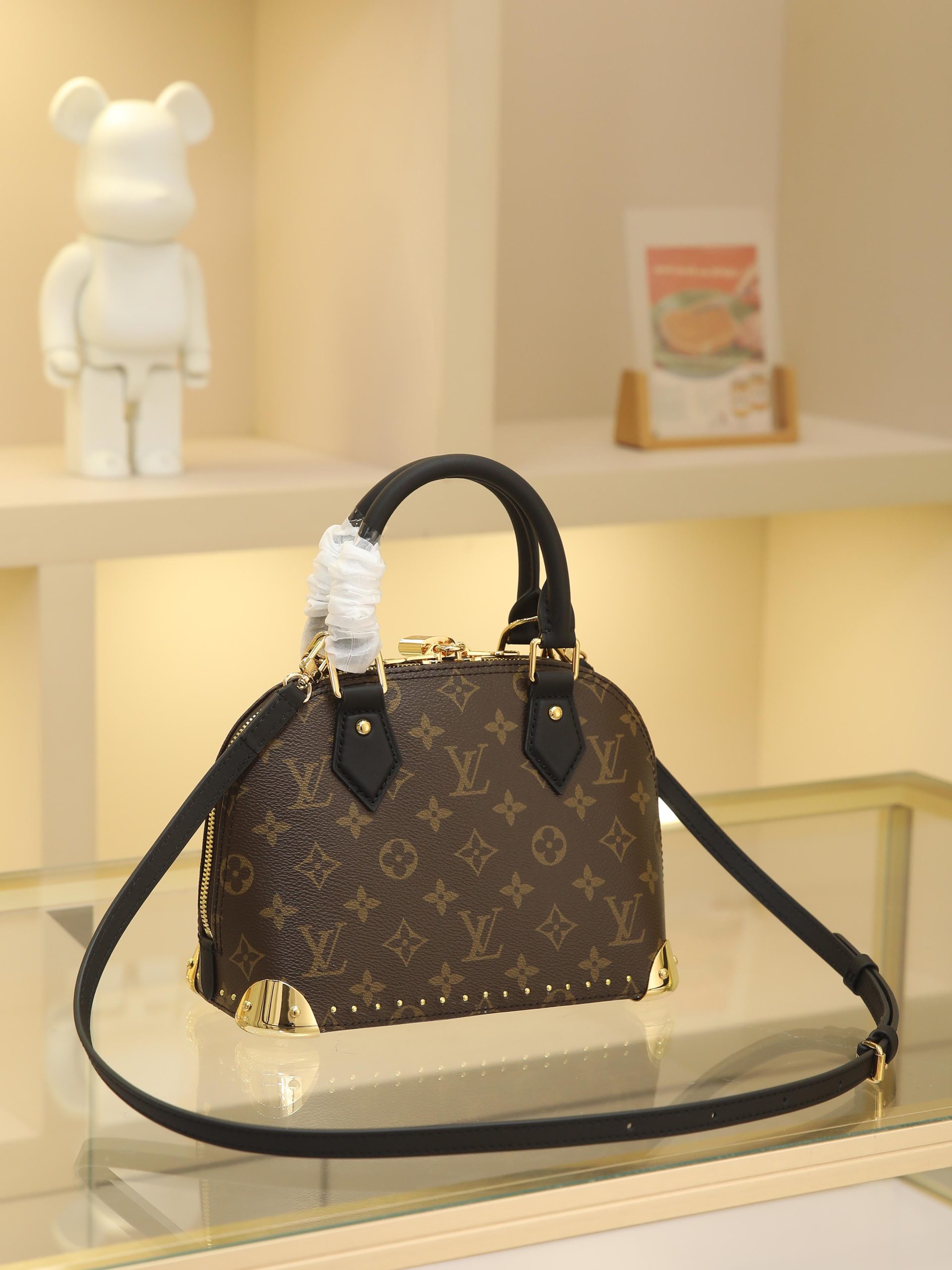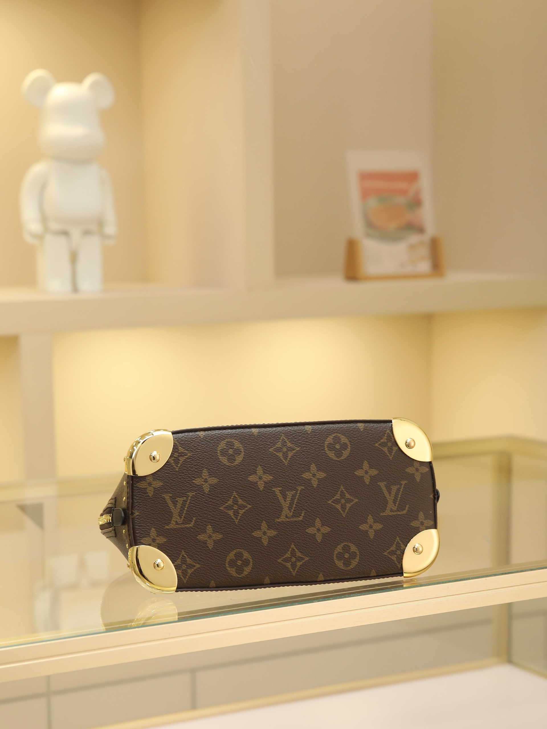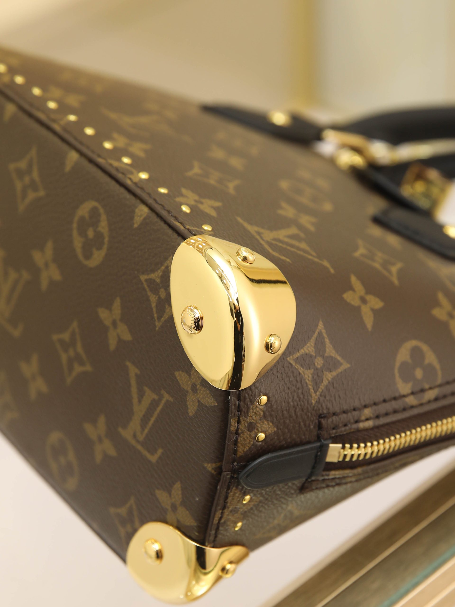The Alma BB handbag has been reimagined as the newest addition to the Trunk collection, paying homage to the brand’s rich heritage of travel with its iconic signature. Crafted from Monogram canvas, it features deep leather trim accented by dazzling metal corners and studs. This version comes with a detachable chain that can be worn with the adjustable shoulder strap or separately.19 x 11 x 22 cm (H x W x L) Monogram coated canvas Cowhide leather trim Fabric lining Metal hardware Zip closure with padlock and key Interior pocket accommodates 6.7-inch smartphone, earphones, Rosalie coin purse, keys, and lipstick Shoulder strap:Removable, adjustable Strap half-length: 50.0 cm Strap half-length adjustable to: 66.0 cm Chain: Removable chain Half-length: 22.0 cm Handles: Double handles