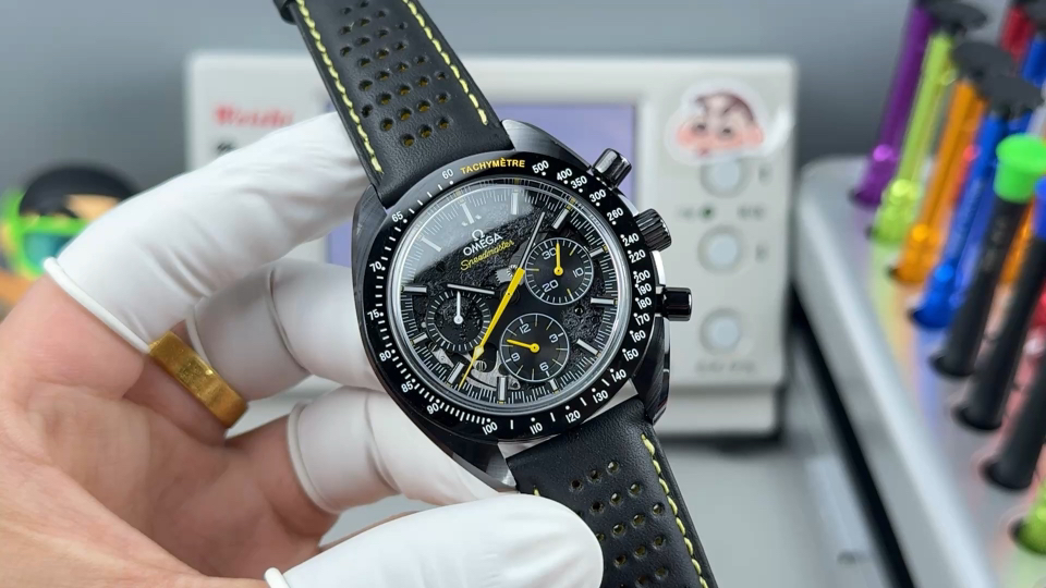 The first-generation “All-Ceramic” Apollo BLS collection debuts Omega’s latest Speedmaster Dark Side of the Moon watch, featuring an all-ceramic construction. Ceramic is an inorganic non-metallic material formed through high-temperature firing. This material enables the creation of high-density watch components with exceptional mechanical properties.Ceramic ranks among consumers’ most favored materials for watches, owing to its striking and diverse colors alongside exceptional properties. Twice as light as stainless steel, ceramic offers superior wear resistance, high scratch resistance, biocompatibility, hypoallergenicity, and non-magnetic properties.This timepiece features a 44.25mm case housing a blackened movement. Laser ablation technology recreates the authentic lunar surface on the movement’s bridges, paying tribute to the Speedmaster’s pivotal role in the Apollo 8 mission.Through the skeletonized dial crafted from black anodized aluminum, the near side of the moon—visible from Earth—is clearly visible. The case back reveals the far side of the moon, seen only by astronauts. The watch is paired with a black micro-perforated rubber strap featuring a striking yellow rubber insert.The entire watch is crafted from black ceramic, featuring a central chronograph seconds hand accented with yellow lacquer and a bezel adorned with laser-engraved, bright white enamel tachymeter scales.The small seconds hand is crafted from Grade 5 titanium, ingeniously shaped to resemble the Saturn V rocket. This 3D form is achieved through laser turning, with color variations created by applying white lacquer, laser ablation, and laser blackening techniques.