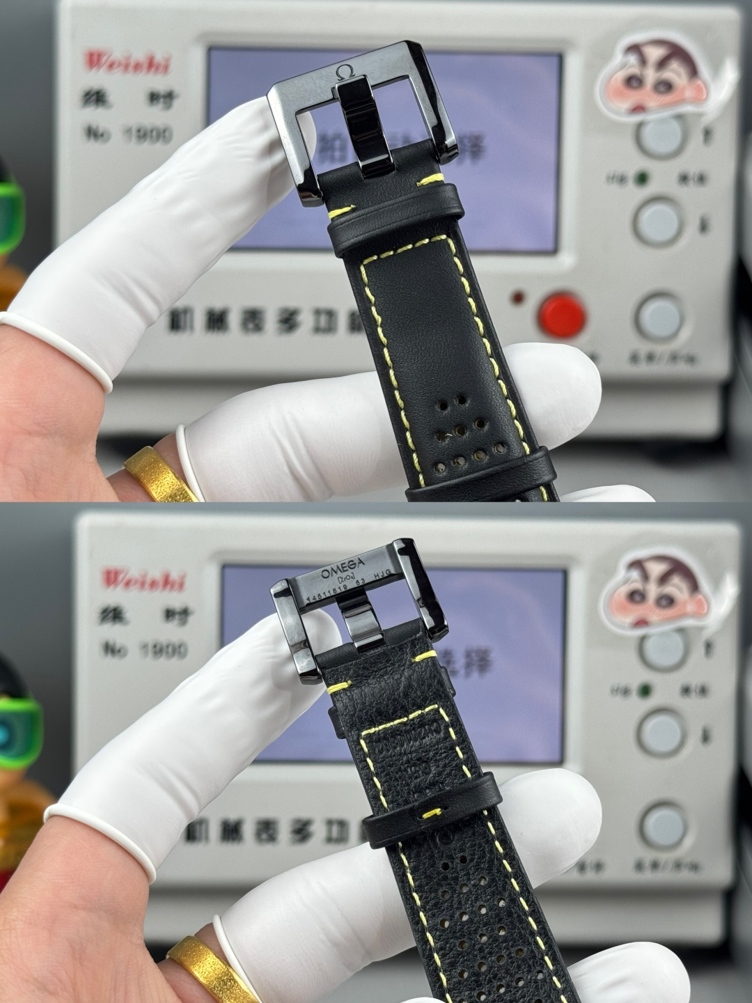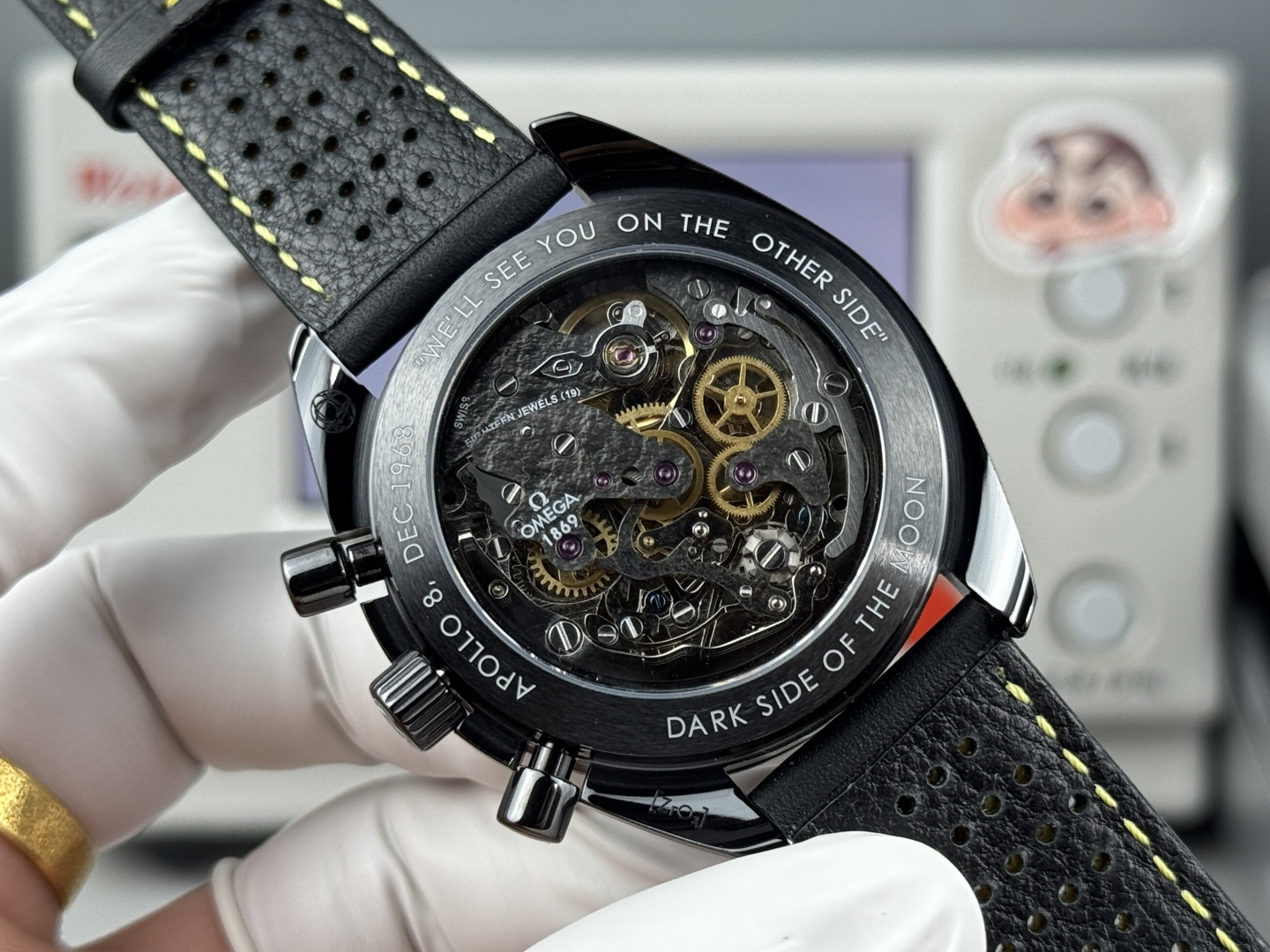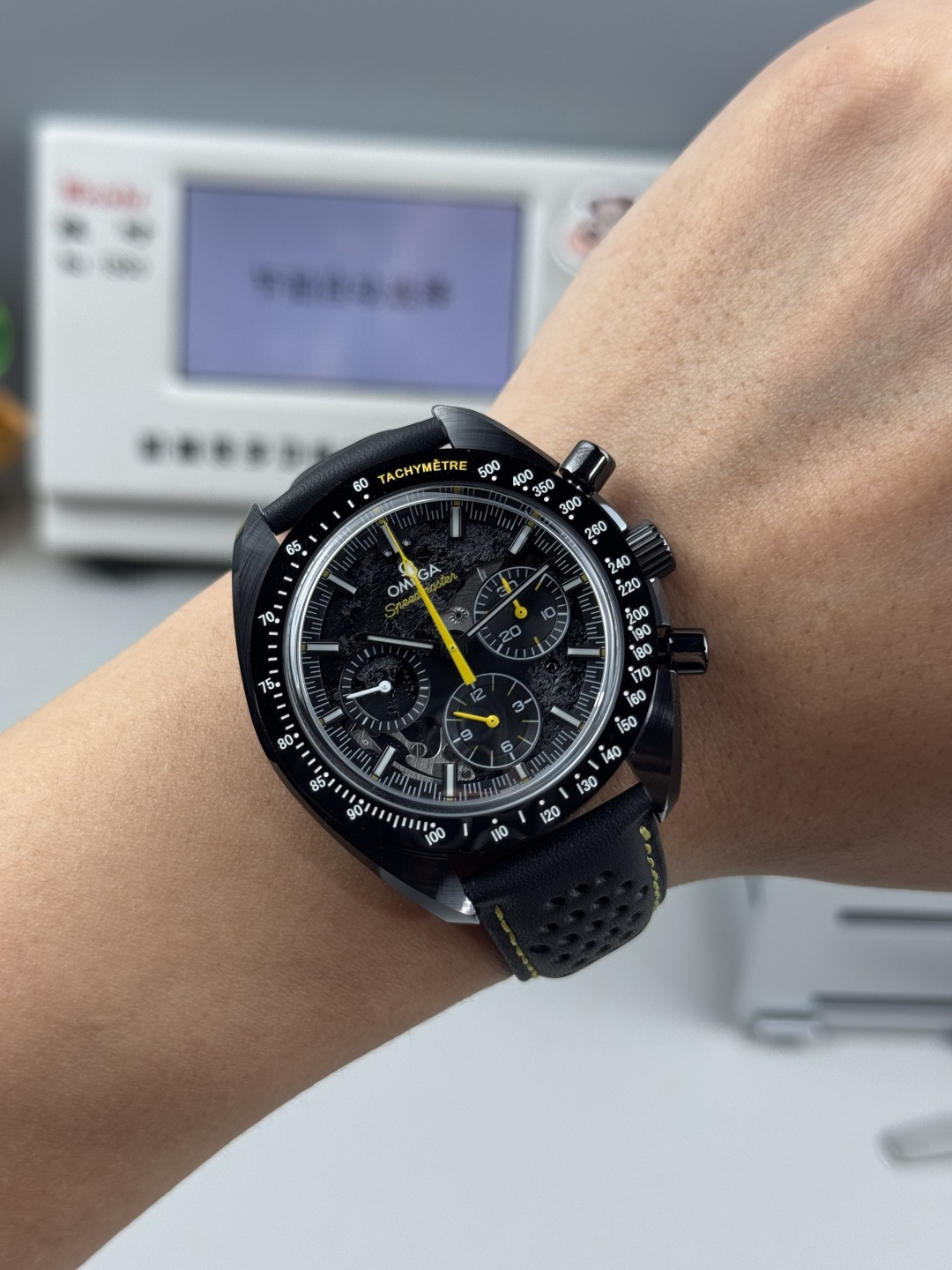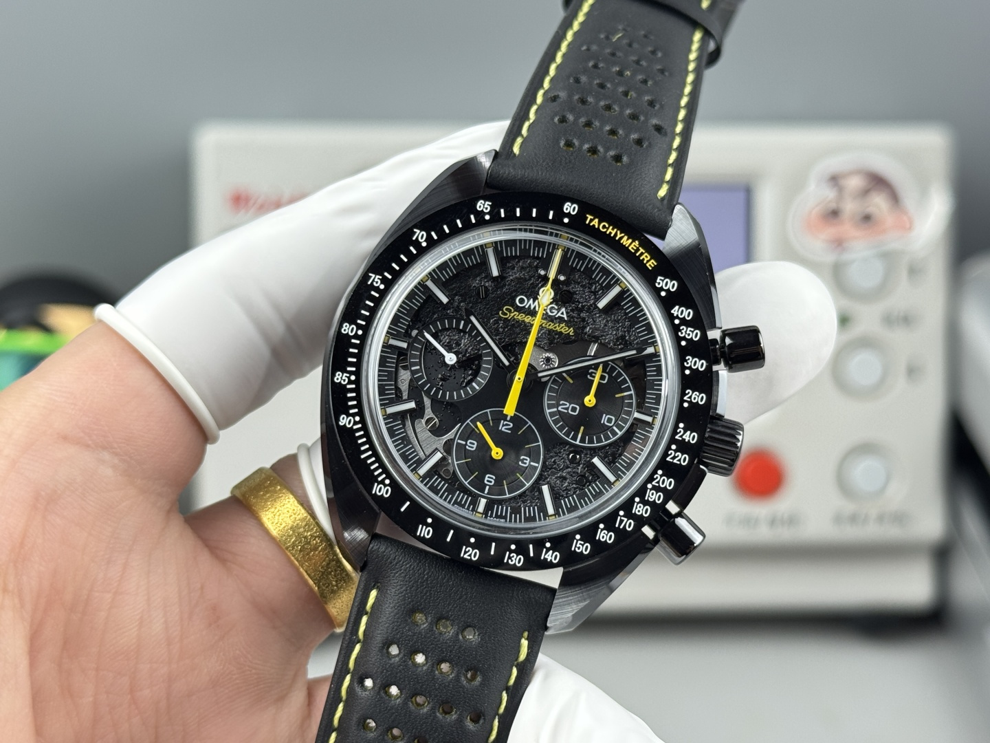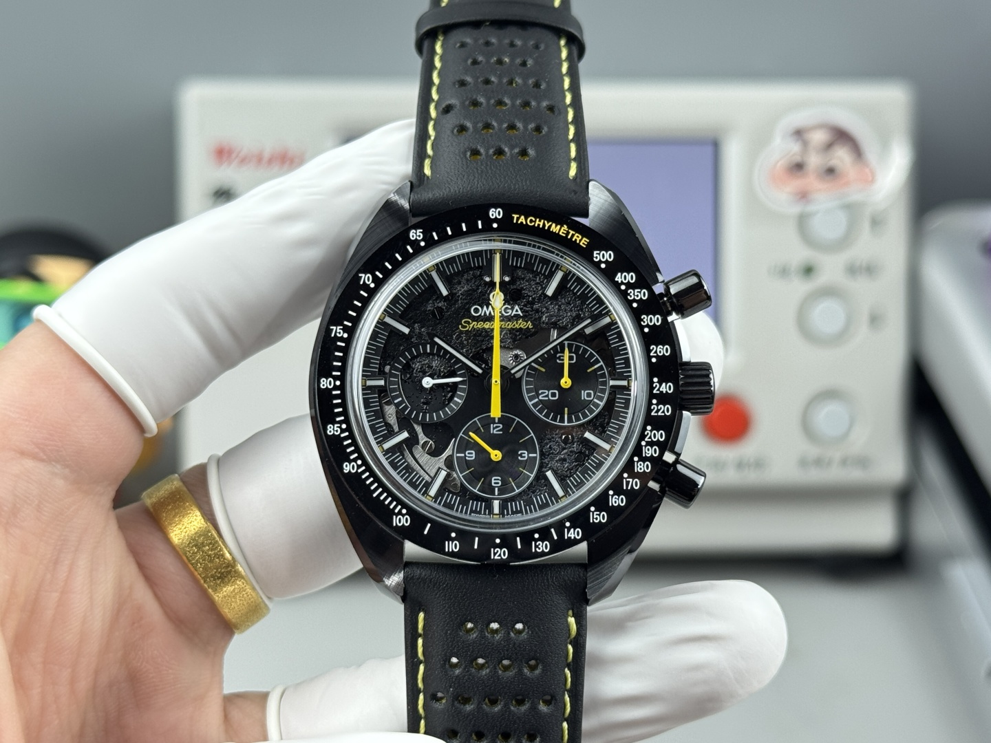 The first-generation “All-Ceramic” Apollo BLS collection debuts Omega’s latest Speedmaster Dark Side of the Moon watch, featuring an all-ceramic construction. Ceramic is an inorganic non-metallic substance formed through high-temperature firing. This material enables the creation of high-density watch components with exceptional mechanical properties.Ceramic ranks among consumers’ most favored materials for watches, owing to its striking and diverse colors alongside exceptional properties. Twice as light as stainless steel, ceramic offers superior wear resistance, high scratch resistance, biocompatibility, hypoallergenicity, and non-magnetic properties.This timepiece features a 44.25mm case housing a blackened movement. Laser ablation technology recreates the authentic lunar surface on the movement’s bridges, paying homage to the Speedmaster’s pivotal role in the Apollo 8 mission.Through the skeletonized dial crafted from black anodized aluminum, the near side of the moon—visible from Earth—is clearly visible. The caseback reveals the far side of the moon, seen only by astronauts. The watch is paired with a black micro-perforated rubber strap featuring a striking yellow rubber insert.The entire watch is crafted from black ceramic, featuring a central chronograph seconds hand adorned with yellow lacquer and a bezel with laser-engraved bright white enamel tachymeter scale.The small seconds hand is crafted from Grade 5 titanium, ingeniously shaped to resemble the Saturn V rocket. This 3D form is achieved through laser milling, with color variations created by applying white lacquer, laser ablation, and laser blackening techniques.