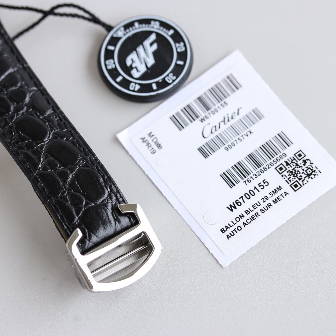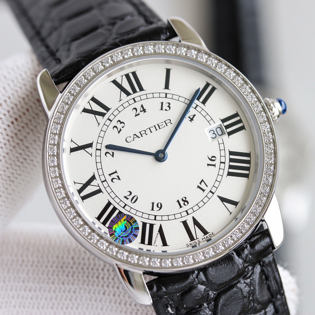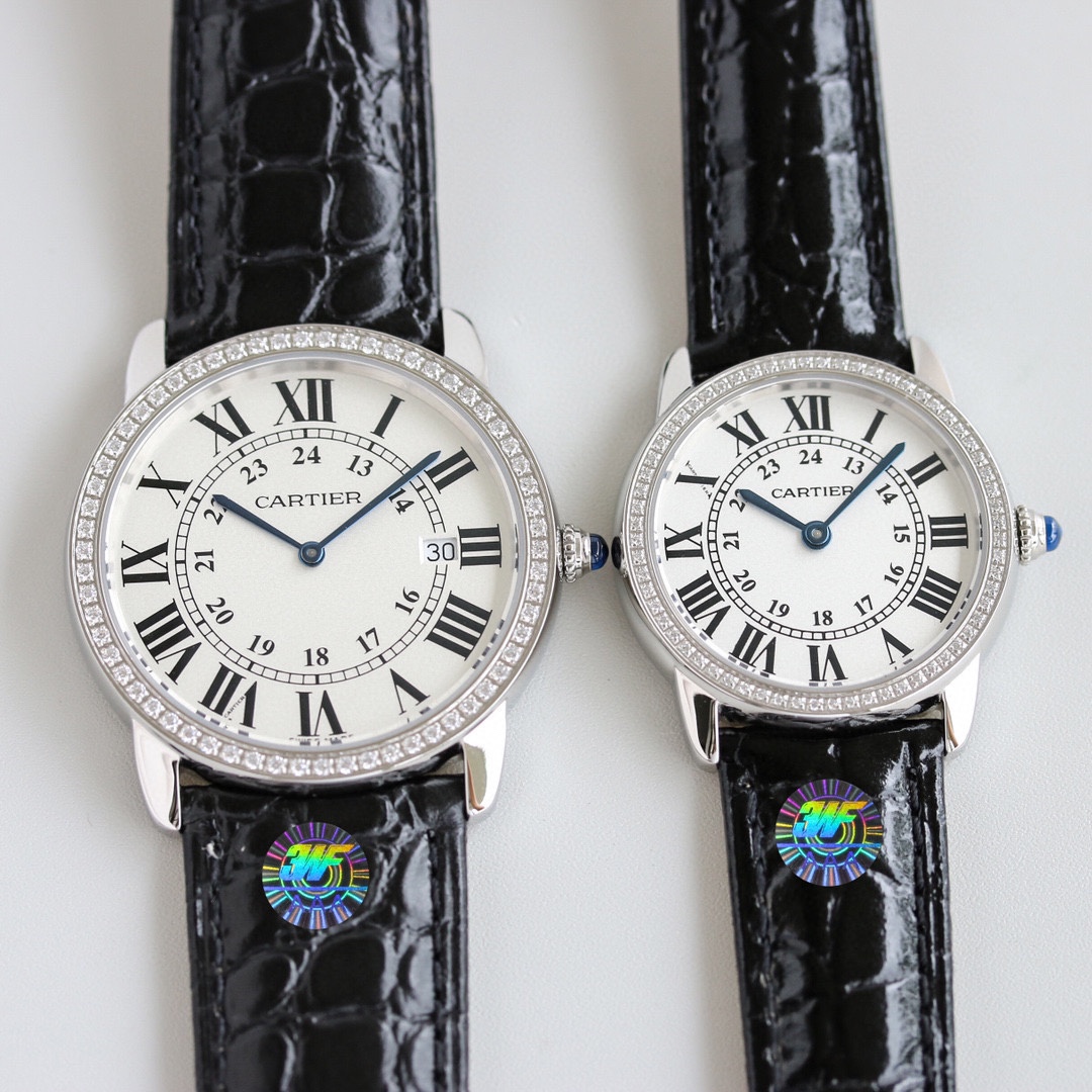The top-tier Cartier Ronde de Cartier London Collection models WSRN0021 and W6700155 were released simultaneously. These couple watches, available in large and small sizes, perfectly preserve the elegant appearance and signature Cartier features: Roman numeral hour markers, sword-shaped blued steel hands,sapphire crystal glass, and a silver-plated pearlescent dial. Its fluid, balanced design exudes a rich luster. Powered by an authentic Swiss-imported quartz movement (movement appearance identical to the original), the large model features a 36mm diameter, while the small model measures 29.5mm in diameter. Paired with an imported Italian calfskin leather strap and an original buckle, it maintains full compatibility with the authentic version.