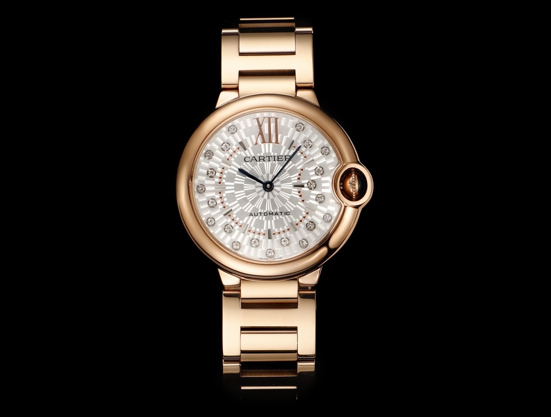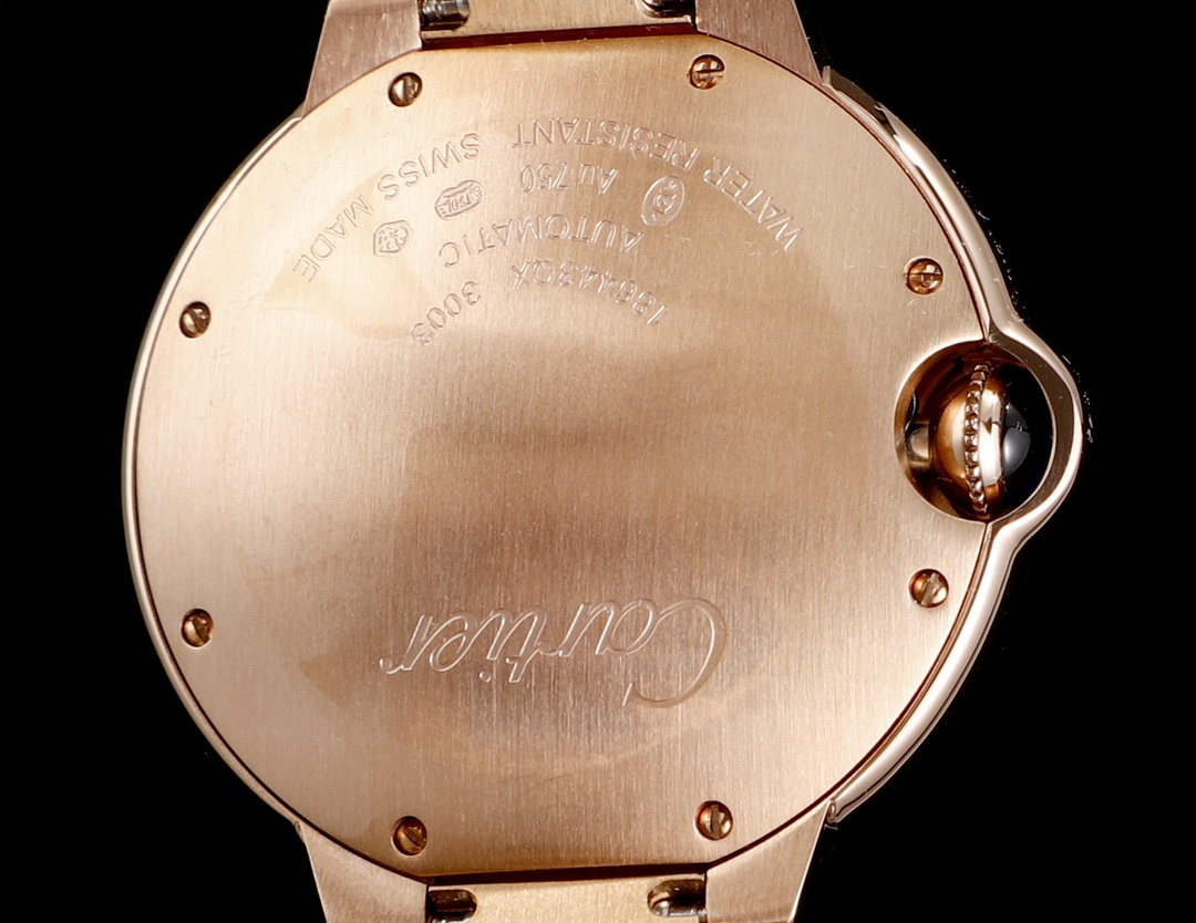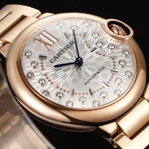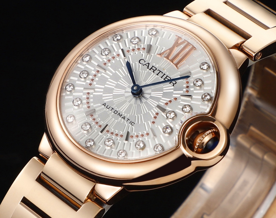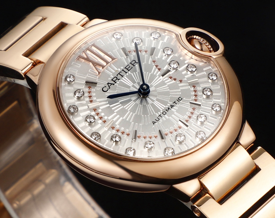 The V6 Cartier Ballon Bleu watch series features two movement options: the Seiko NH05 and the Swiss 2671. The 2022 collection introduces 33mm and 36mm models, both standard-equipped with alligator leather straps or rose gold bracelets. The 33mm model measures 10.06mm in thickness.The 33mm model measures 10.06mm thick, while the 36mm version is 12.05mm thick. The dial is crafted from 316L stainless steel with a sapphire crystal double-curved glass. The hands feature a blued steel finish, and each dial is meticulously CNC-engraved. The crown incorporates genuine gemstones, with sapphires that turn red under UV light. Every detail is flawless—this is the ultimate timepiece, truly one of a kind.