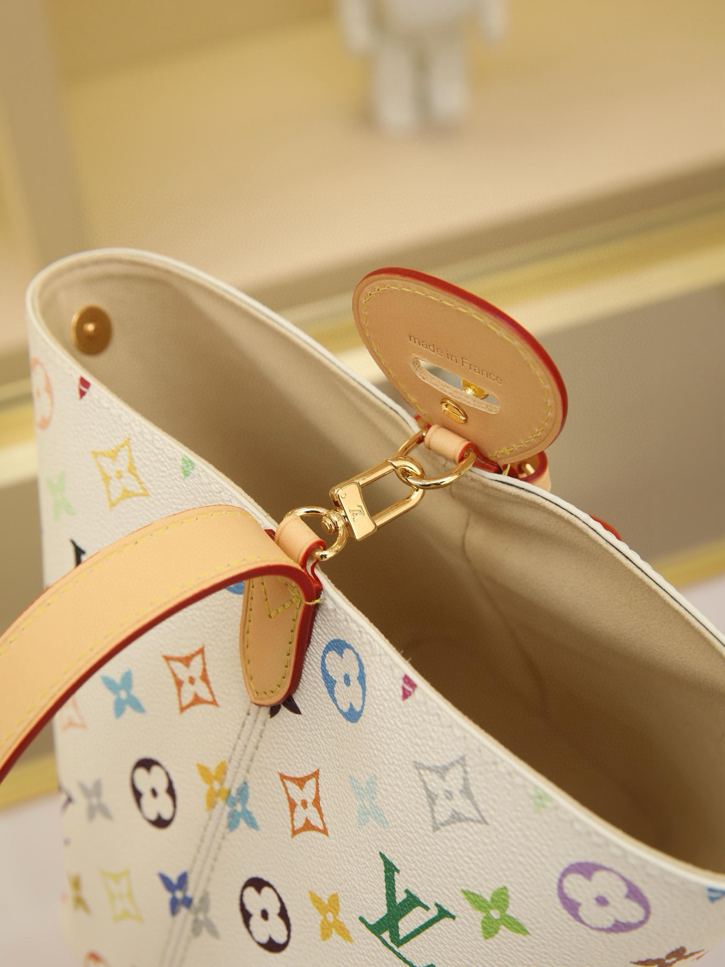 This All In BB handbag showcases playful details from the x Takashi Murakami reissue collection. Monogram coated canvas displays the artist’s vibrant rainbow hues, while the signature logo is adorned with bow and padlock accents. Adjustable calf leather handles and a leather shoulder strap allow versatile carrying options—by hand, over the shoulder, or crossbody.Dimensions: 16*12*18cm
