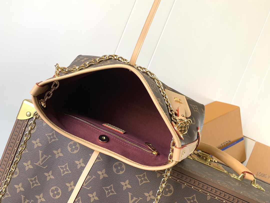 This CarryAll BB bag in Monogram canvas features a dazzling chain adorned with Monogram flowers, adding a trendy touch to both day and night occasions.The leather label complements the drawstring closure, while a zippered inner pocket provides convenient access for daily essentials like credit cards. 17 x 10 x 26 cm (H x W x L) Monogram coated canvas Cowhide leather trim Fabric lining Metal hardware Drawstring and magnetic closure Zippered inner pocket Label Holds smartphone, keys,Zippy wallet, and earphones. Shoulder strap: Non-removable, adjustable. Strap half-length: 40.0 cm. Strap half-length adjustable to: 50.0 cm. Handle: Single handle, removable.