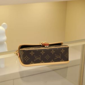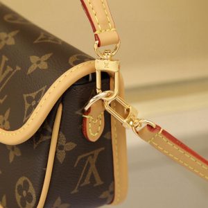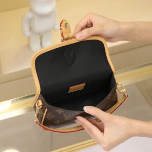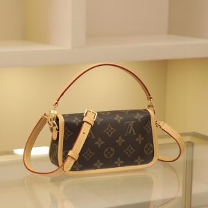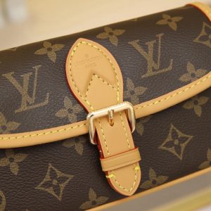 This Diane mini handbag features a Monogram canvas body with vintage elements like leather corners and a traditional clasp. A miniature version of the Diana model, it offers ample space for your phone and other essentials. It showcases the most distinctive details of the original design, such as the circular flap and belt closure. This versatile piece, perfect for day or night, features adjustable wings and a waist strap, both of which are removable.19 x 10.5 x 6 cm (L x H x W)