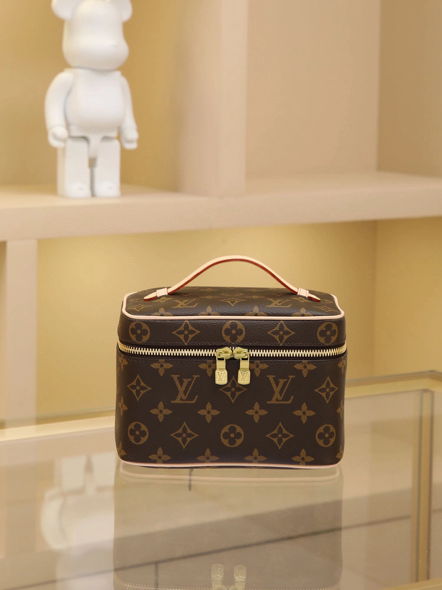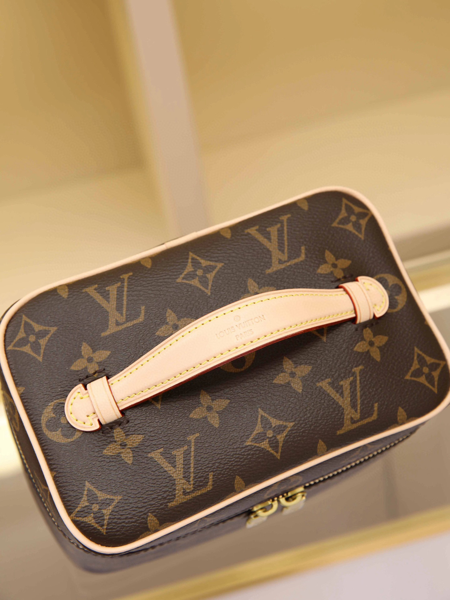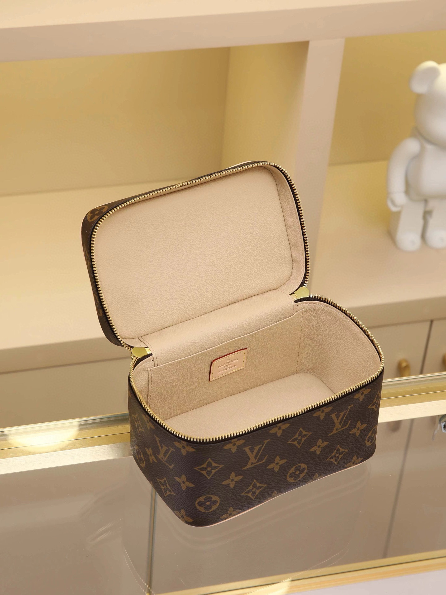 This elegant toiletry bag, inspired by the iconic Nice makeup case, is a personalized choice for carrying essential beauty products. A hidden zippered pocket inside the flap provides secure storage for particularly valuable personal items. Dimensions: 20 × 13.5 × 12 cm.