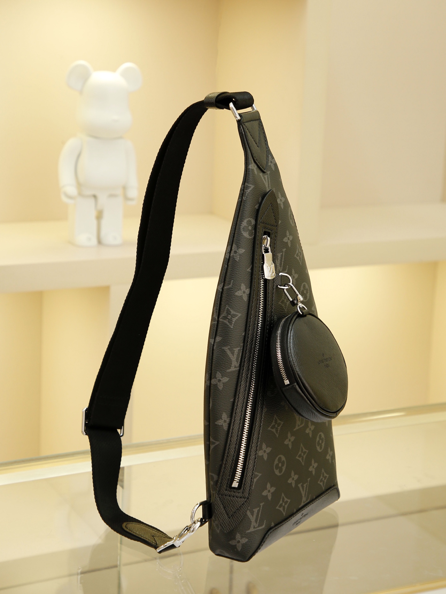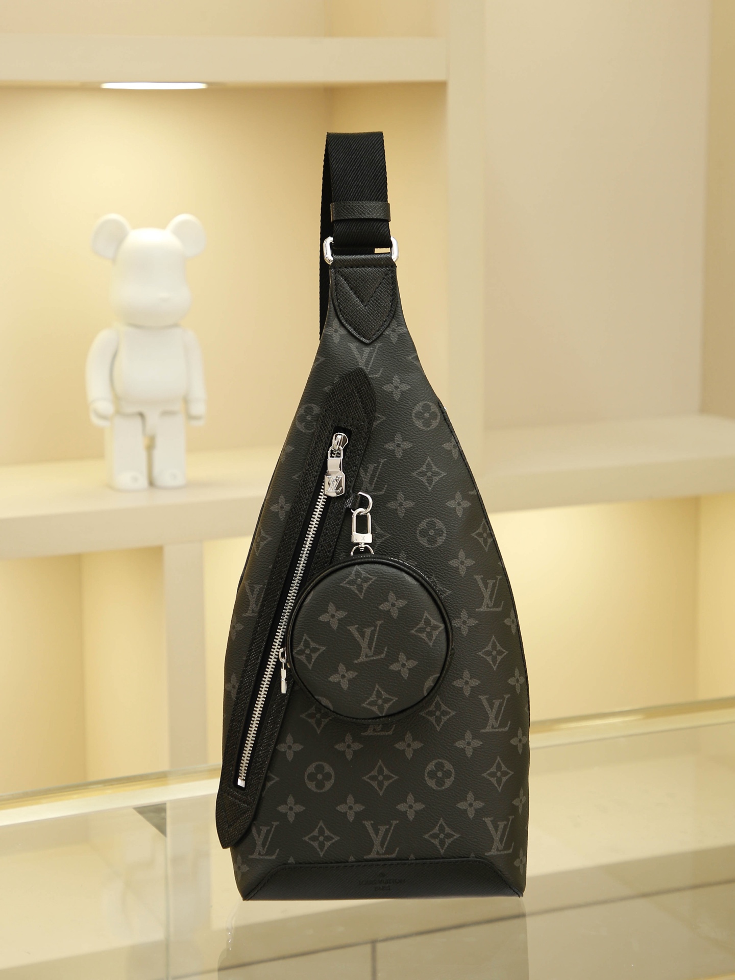 This shoulder bag combines Monogram canvas with Taïga calf leather, featuring a removable zippered pouch for coins or essentials and a zippered side pocket. It reinterprets versatile street style with a relaxed aesthetic, offering an alternative to traditional backpacks. Dimensions: 20 x 42 x 6 cm.