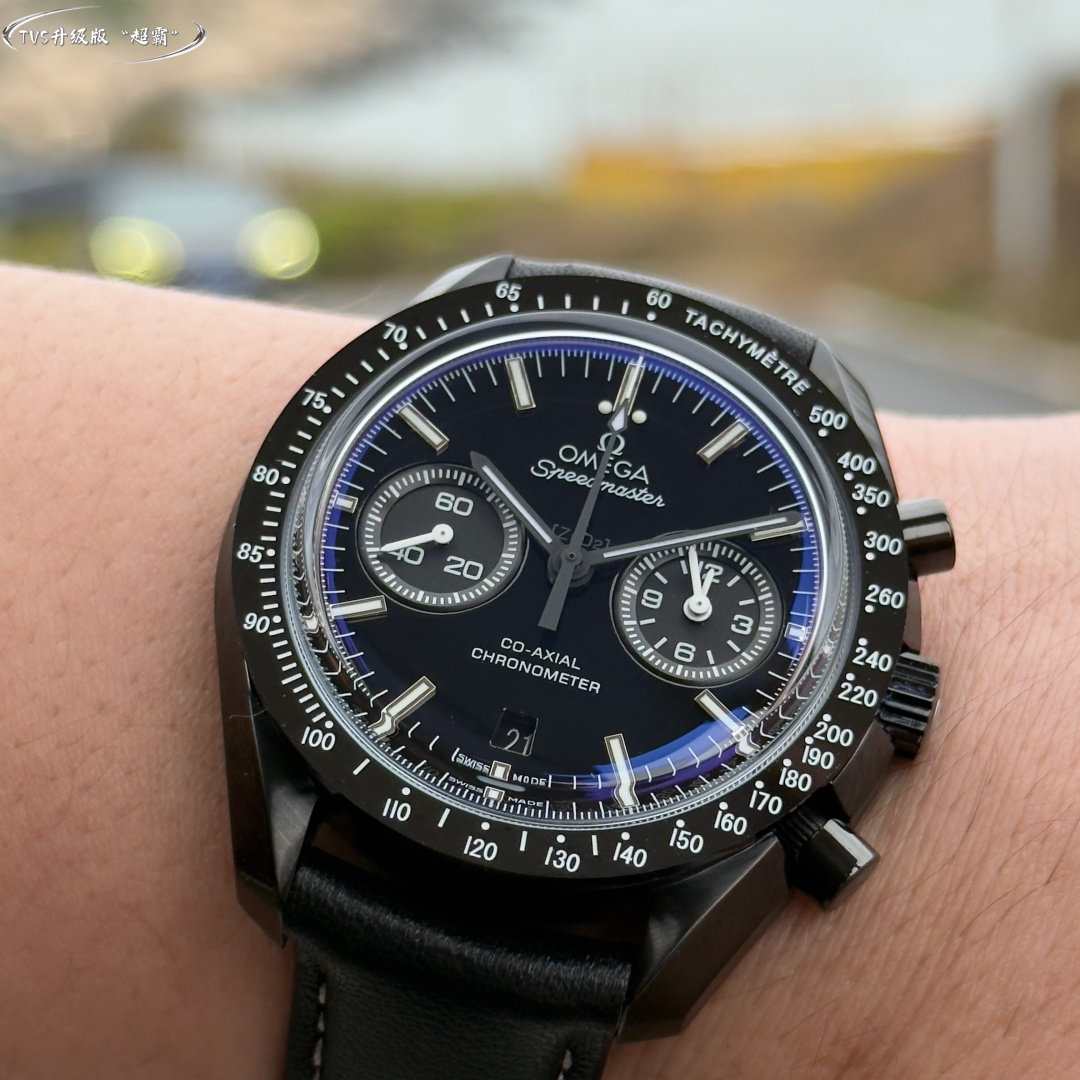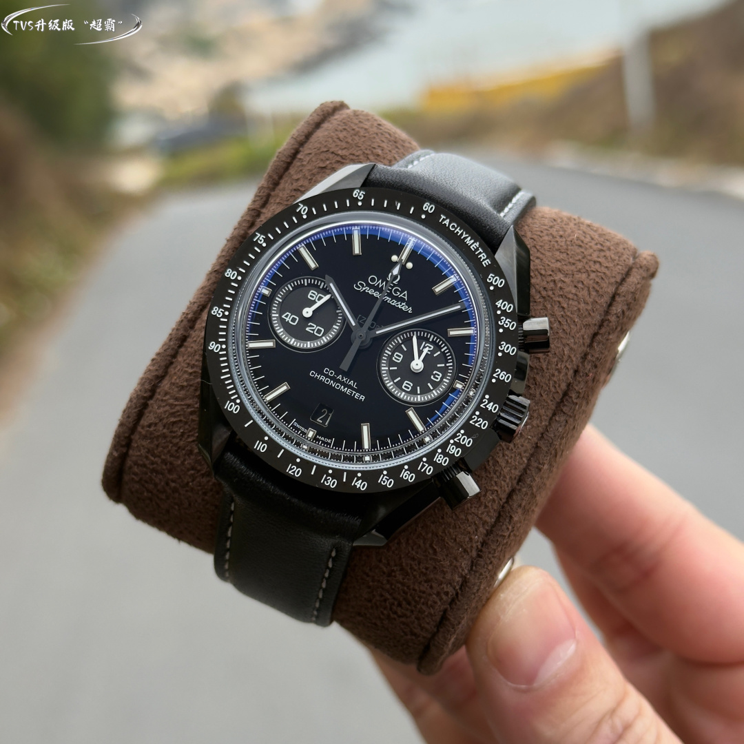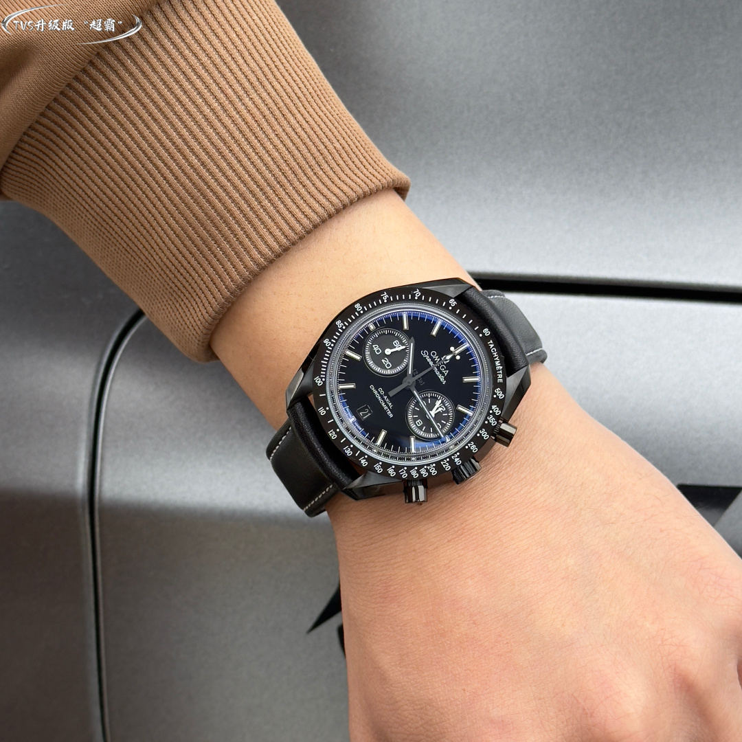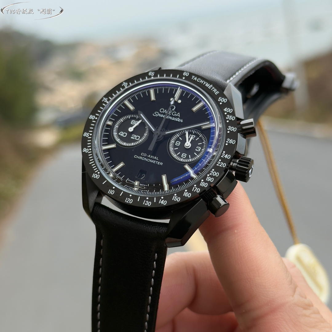 TVS Pioneer Edition: Omega Speedmaster Dark Side of the Moon Watch 311.92.44.51.01.0054 25mm Co-Axial Chronograph, in-house developed 9300 movement 3 o’clock sub-dials display 【12-hour】 and 【30-minute】 cumulative timekeeping All functions and aesthetics meticulously crafted to replicate the original 【1-1】 model.Movement: 9300 Dual-T Black Balance Wheel, Automatic Co-Axial Master Chronometer Chronograph Movement. Rhodium-plated movement with distinctive Arabic-style Geneva waves. Bezel: Brushed ceramic. Dial: Matte dark gray ceramic dial. Case: Brushed black. Strap: Black nylon fabric strap. Crystal: Double-domed sapphire crystal. Scratch-resistant. Functions: Date display, Chronograph.