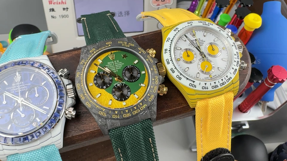 TW Factory ROLEX Cosmograph Daytona Carbon Fiber Custom Edition. This timepiece offers lightweight comfort while maintaining a robust exterior. Each watch features a uniquely patterned carbon fiber material. 【Case】 Dimensions of 40×12.4mm perfectly match the original. TW Factory masterfully crafts the distinctive character of carbon fiber Rolex watches.Exclusively in the market, the entire case, bezel, and caseback are crafted from high-composite carbon fiber and ultra-bright luminous powder. Details undergo hand-finished chamfering and polishing for exceptional texture. 【Bracelet Clasp】The strap features a hand-woven synthetic fiber band, offering breathable comfort and soft texture. 【Movement】Equipped with the latest precise and mature Shanghai 4130 movement, it perfectly delivers powerful functionality—the ultimate value for money!!!