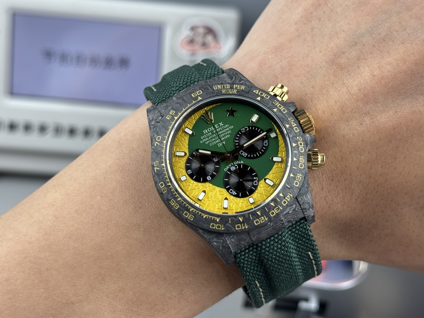 TW Factory ROLEX Cosmograph Daytona Carbon Fiber Custom Edition. This timepiece offers lightweight comfort while maintaining a robust exterior. Each watch features a uniquely patterned carbon fiber material. 【Case】 Dimensions of 40×12.4mm perfectly match the original. TW Factory masterfully crafts the distinctive character of carbon fiber Rolex watches.Exclusively in the market, the entire case, bezel, and caseback are crafted from high-composite carbon fiber and ultra-bright luminous powder. Details undergo meticulous hand-polishing with chamfered edges, delivering exceptional texture. 【Bracelet Clasp】The strap features a hand-woven synthetic fiber band, offering breathable comfort and soft texture. 【Movement】Equipped with the latest precise and mature Shanghai 4130 movement, it perfectly achieves powerful functionality—the ultimate value for money!!!