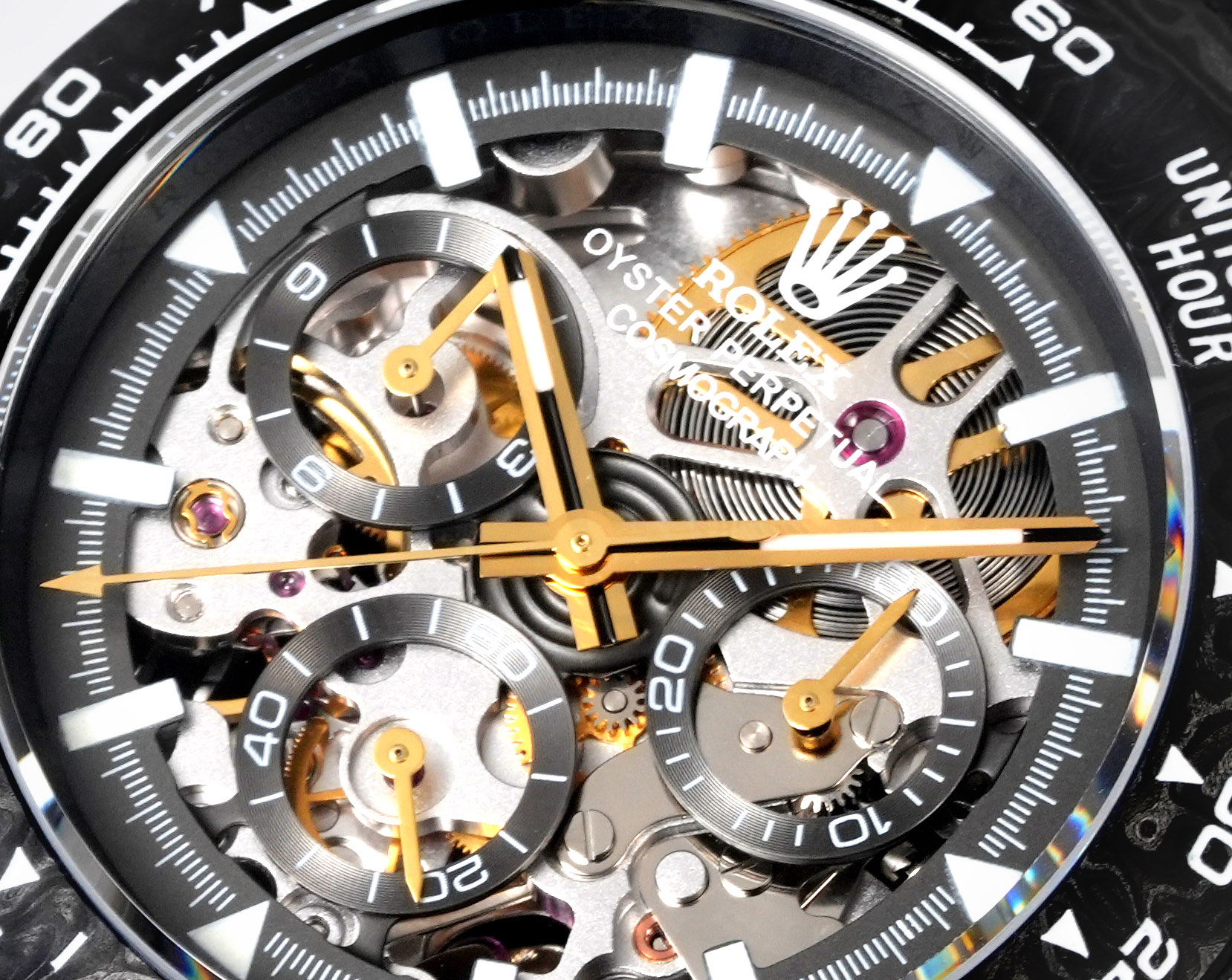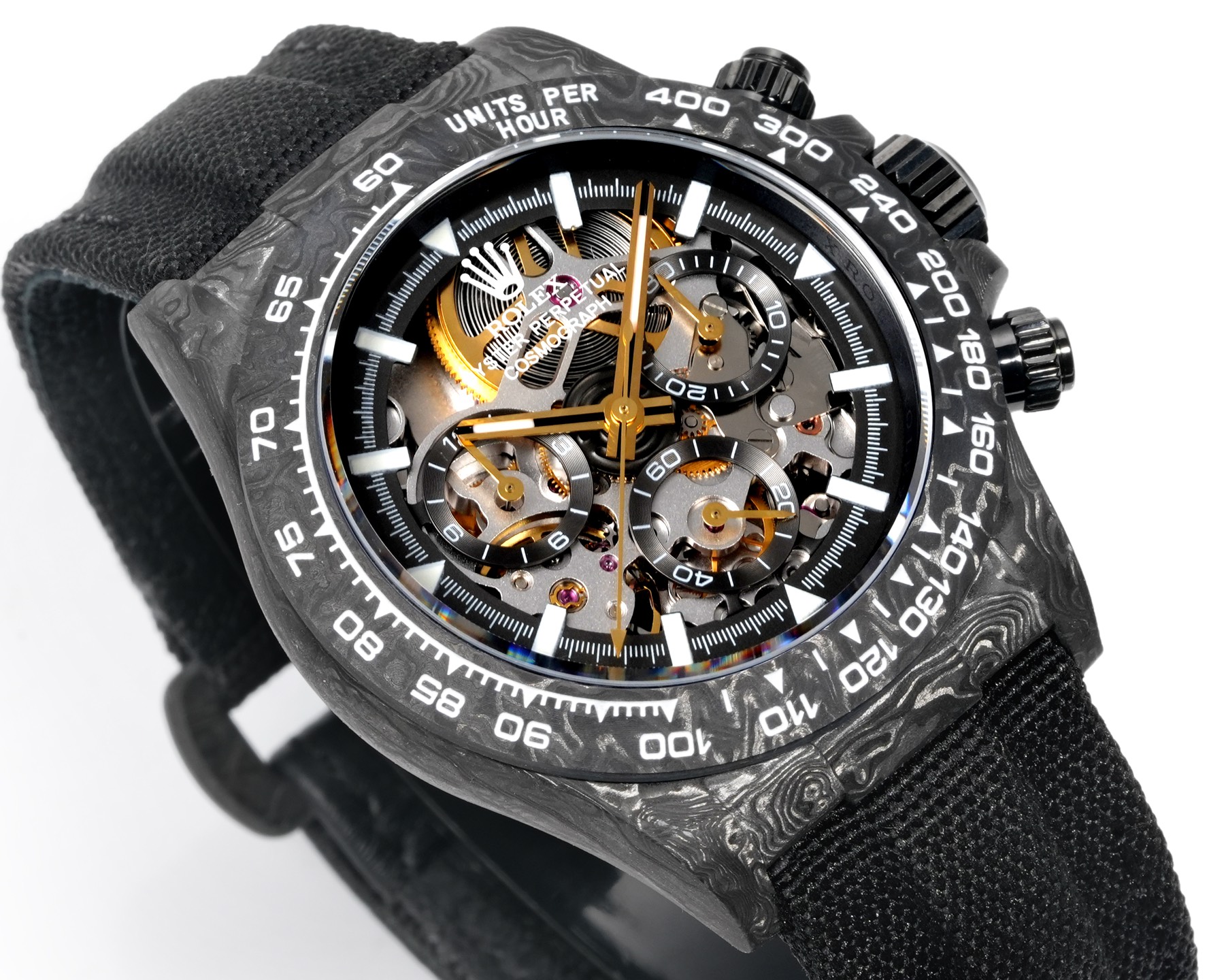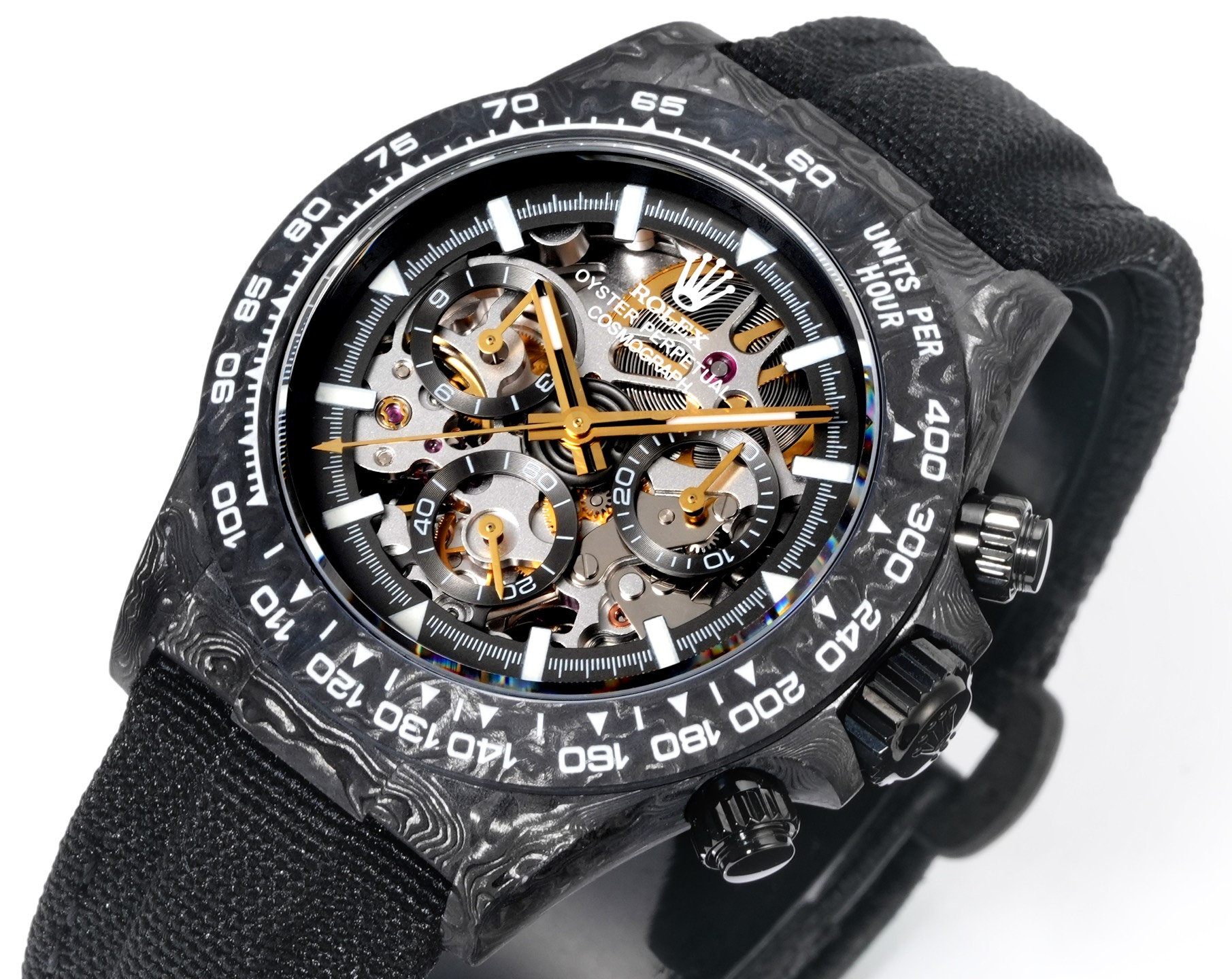 TW Factory ROLEX Cosmograph Daytona Carbon Fiber Custom Edition. This timepiece offers lightweight comfort while maintaining a robust exterior. Each watch features a uniquely patterned carbon fiber material. 【Case】 Dimensions of 40×12.4mm perfectly match the original. TW Factory masterfully crafts the distinctive character of carbon fiber Rolex watches.Exclusively in the market, the entire case, bezel, and caseback are crafted from high-composite carbon fiber and ultra-bright luminous powder. Details undergo hand-polished chamfering for exceptional texture. 【Bracelet Clasp】The strap features a hand-woven synthetic fiber band, offering breathable comfort and soft texture. 【Movement】Equipped with the latest precise and mature 4802 movement, it perfectly delivers powerful functionality—the ultimate value for money!!!