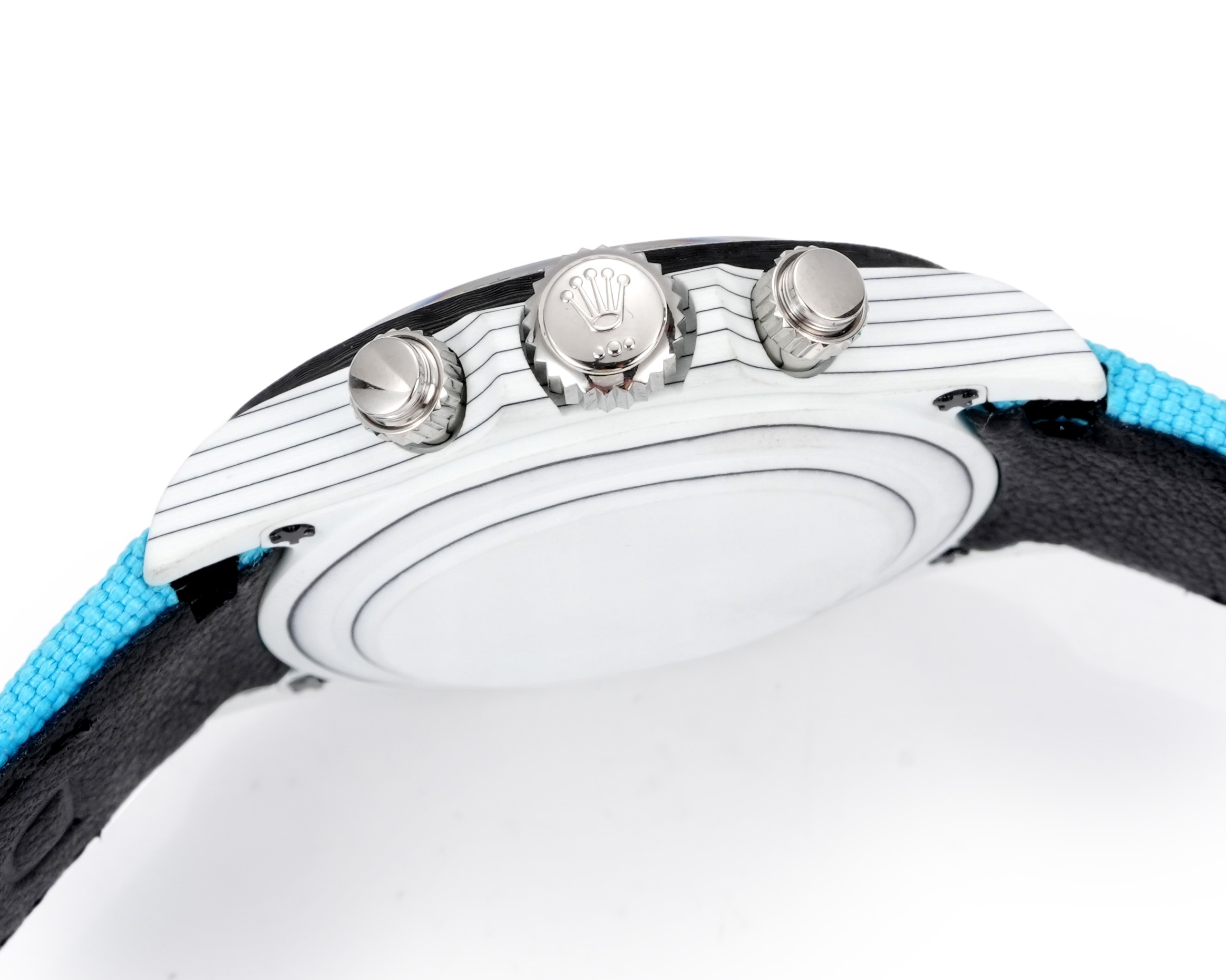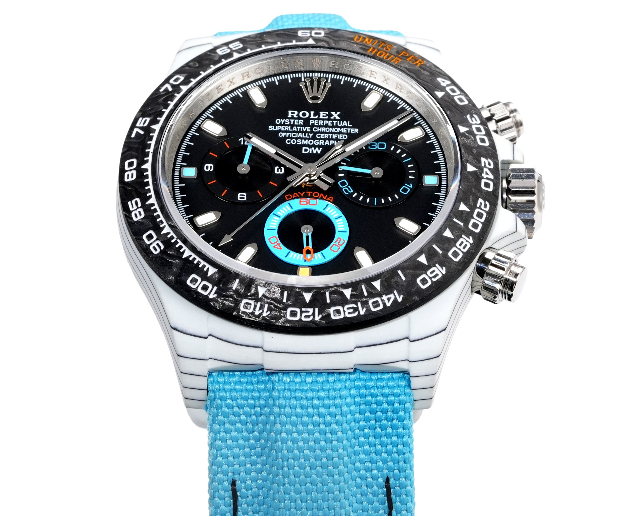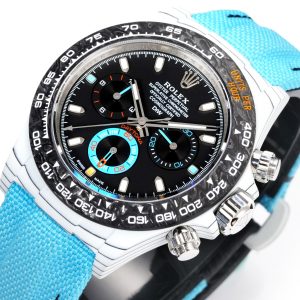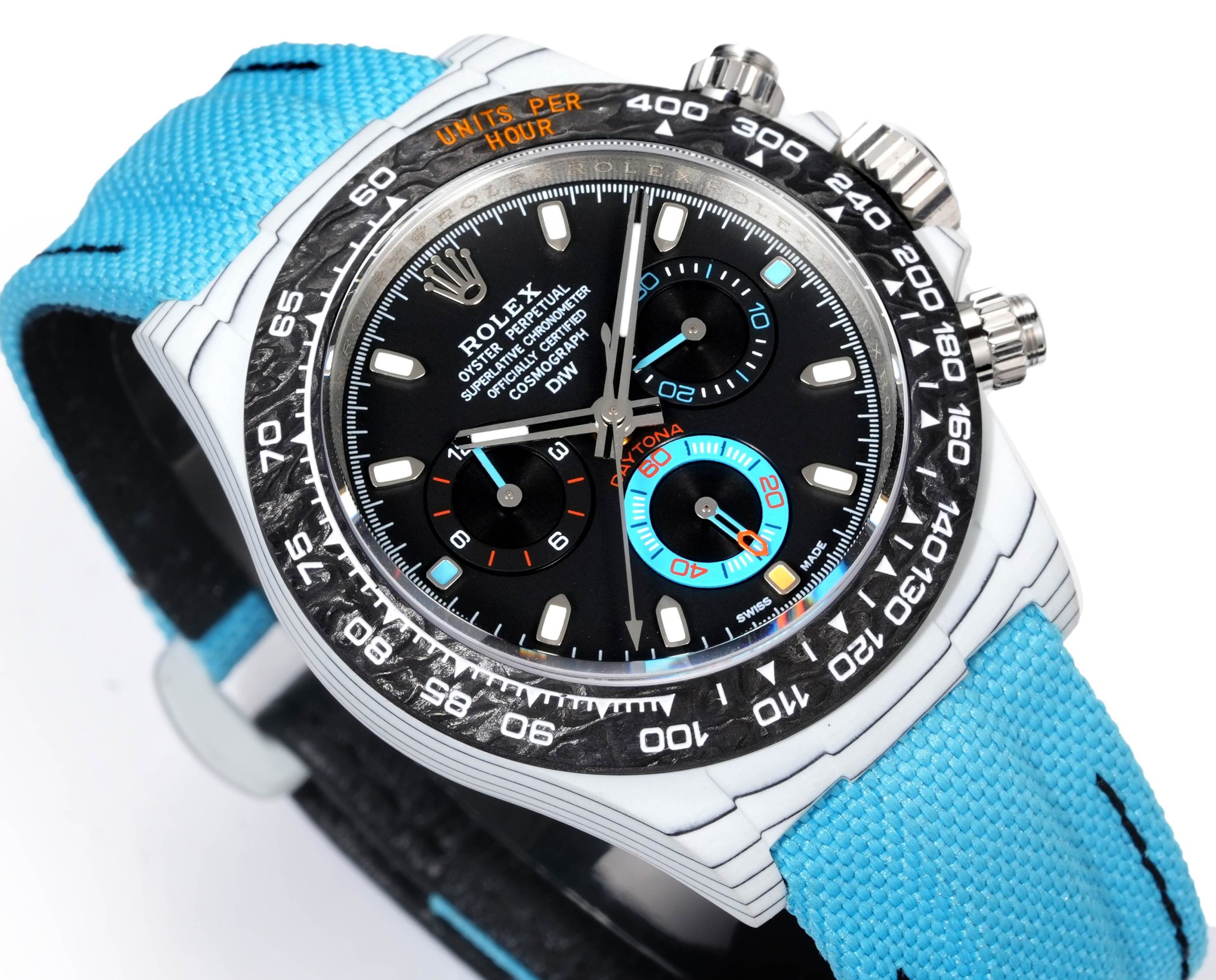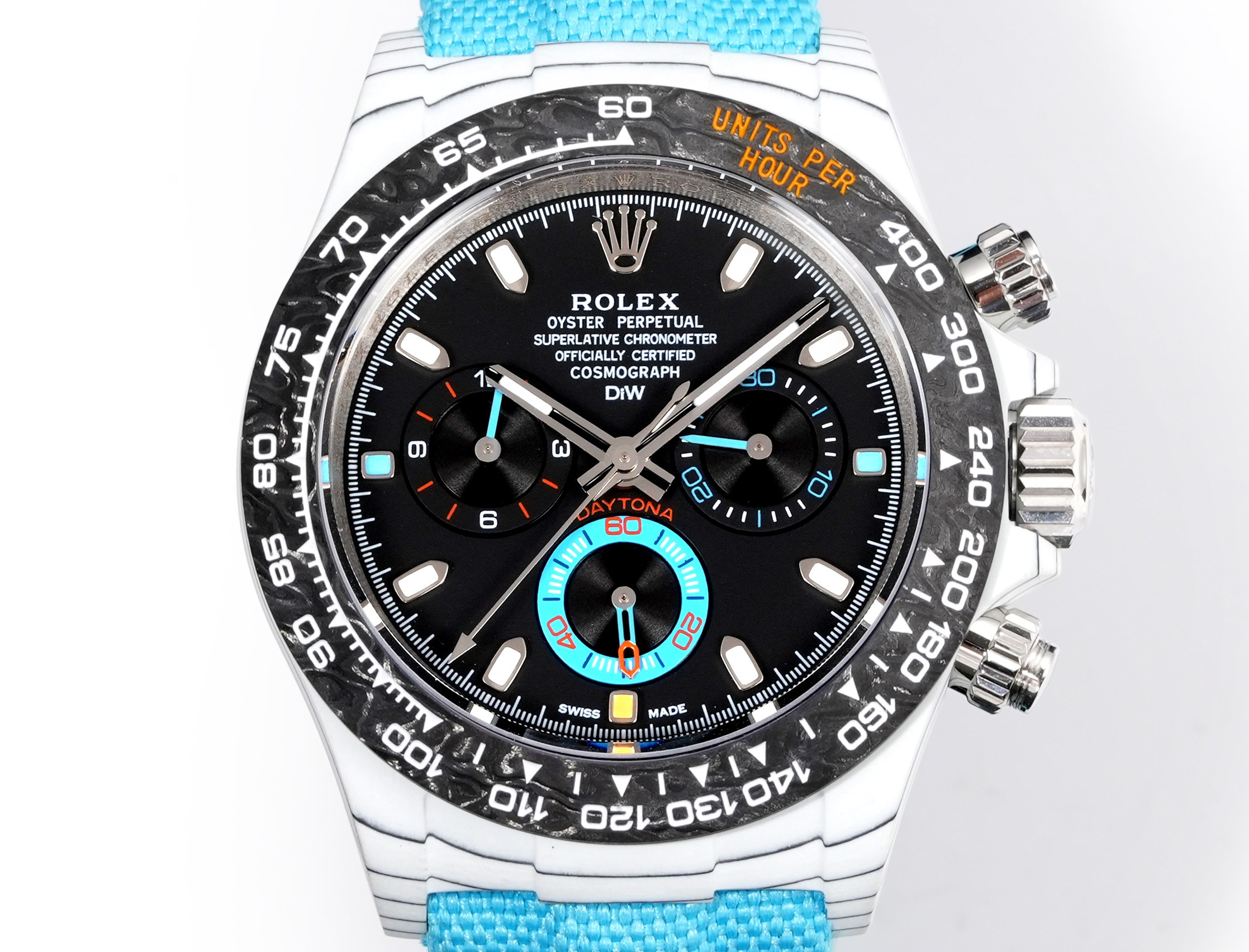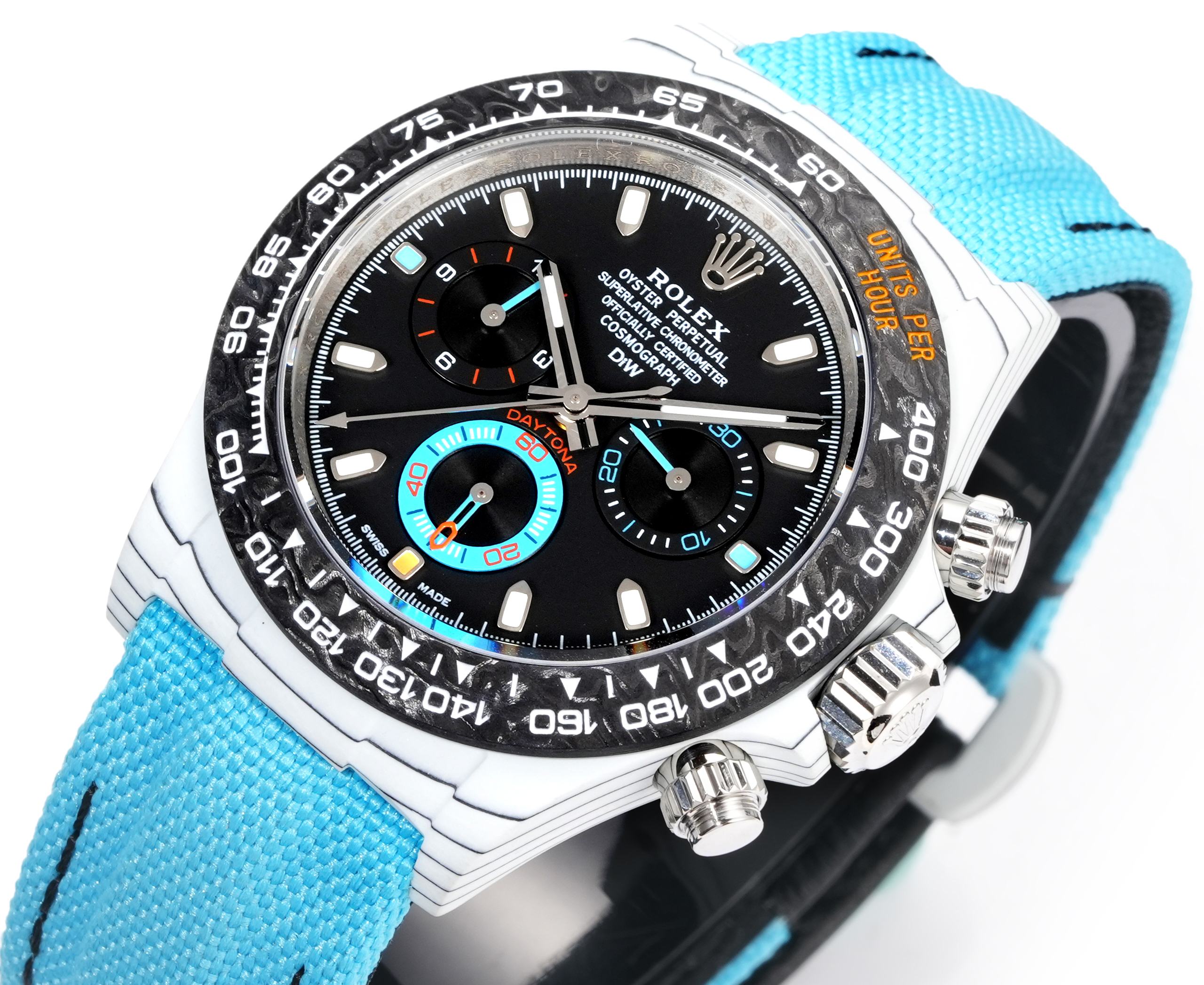 TW Factory ROLEX Cosmograph Daytona Carbon Fiber Custom Edition. This timepiece offers lightweight comfort while maintaining a robust exterior. Each watch features a uniquely patterned carbon fiber material. 【Case】 Dimensions of 40×12.4mm perfectly match the original. TW Factory masterfully crafts the distinctive character of carbon fiber Rolex watches.Exclusively in the market, the entire case, bezel, and caseback are crafted from high-composite carbon fiber and ultra-bright luminous powder. Details undergo hand-finished chamfering and polishing for exceptional texture. 【Bracelet Clasp】The strap features a hand-woven synthetic fiber band, offering breathable comfort and soft texture. 【Movement】Equipped with the latest precise and mature Shanghai 4130 movement, it perfectly delivers powerful functionality—the ultimate value for money!!!