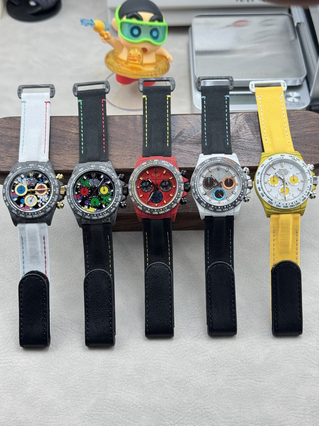 TW Factory ROLEX Cosmograph Daytona Carbon Fiber Custom Edition. This timepiece offers lightweight comfort while maintaining a robust exterior. Each watch features a uniquely patterned carbon fiber material. 【Case】 Dimensions of 40×12.4mm perfectly match the original. TW Factory masterfully crafts the distinctive character of carbon fiber Rolex.Exclusively in the market, the entire case, bezel, and caseback are crafted from high-composite carbon fiber and ultra-bright luminous powder. Details undergo hand-finished chamfering and polishing for exceptional texture. 【Bracelet Clasp】The strap features a hand-woven synthetic fiber band, offering breathable comfort and soft texture. 【Movement】Equipped with the latest precise and mature Shanghai-made 4130 movement, it perfectly delivers powerful functionality—the ultimate value for money!!!