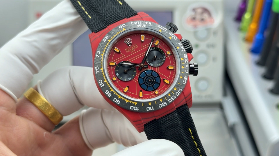 TW Factory ROLEX Cosmograph Daytona Carbon Fiber Custom Edition. This timepiece offers lightweight comfort while maintaining a robust exterior. Each watch features a uniquely patterned carbon fiber material. 【Case】 Dimensions of 40×12.4mm perfectly match the original. TW Factory masterfully crafts the distinctive character of carbon fiber Rolex watches.Exclusively in the market, the entire case, bezel, and caseback are crafted from high-composite carbon fiber and ultra-bright luminous powder. Details undergo hand-finished chamfering and polishing for exceptional texture. 【Bracelet Clasp】The strap features a hand-woven synthetic fiber band, offering breathable comfort and soft texture. 【Movement】Equipped with the latest precise and mature Shanghai 4130 movement, it perfectly delivers powerful functionality—the ultimate value for money!!!