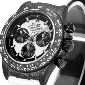 ROLEX Cosmograph Daytona Carbon Fiber Luminous Case Custom Edition. This timepiece offers lightweight comfort with a rugged exterior. Each watch features a unique carbon fiber pattern.