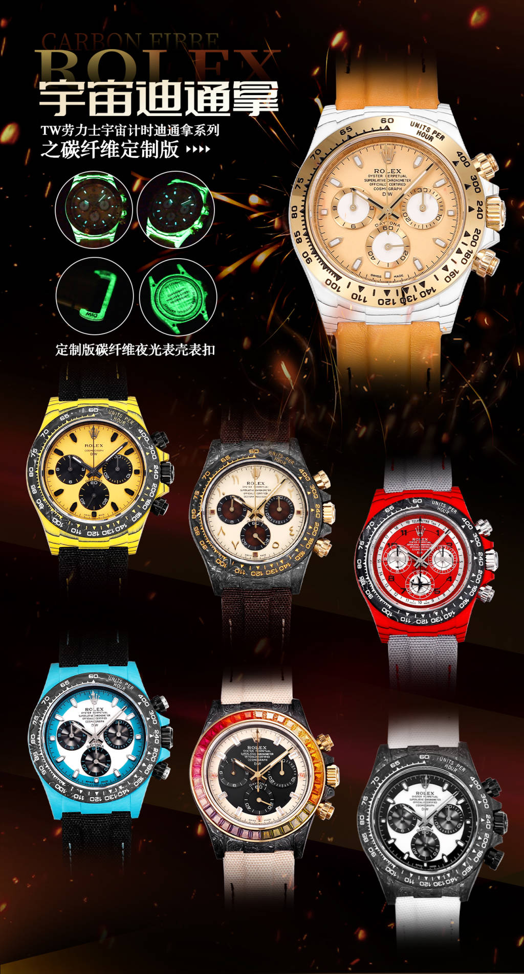 TW Factory (Updated Custom High-Intensity Luminous Case + Luminous Buckle) ROLEX Cosmograph Daytona Series Carbon Fiber Luminous Case Custom Edition. This timepiece offers lightweight comfort while maintaining a robust exterior. Each watch features a uniquely patterned carbon fiber material. 【Case】Dimensions 40×12.4mm perfectly match the original. TW Factory masterfully captures the distinctive essence of carbon fiber Rolex. Market-exclusive construction: entire case, bezel, and caseback crafted from high-composite carbon fiber infused with ultra-bright luminous powder. Meticulous hand-polished chamfers on every detail deliver exceptional texture.【Bracelet Clasp】The strap is crafted from synthetic fiber weave, offering breathable comfort and a soft texture. 【Movement】Features the latest precise and mature 4801 movement (functionality and thickness identical to the 4130), perfectly delivering powerful functionality. The ultimate value for money!!!