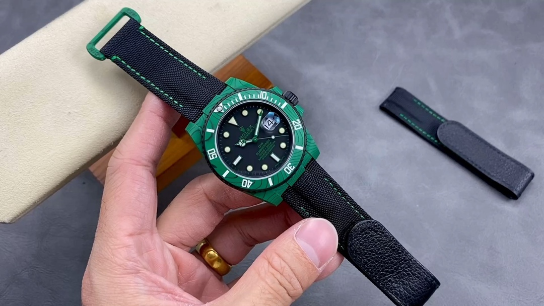 VS Rolex Custom New Model: Green Devil Submariner 1. Compatible with genuine 3135 movement—the ultimate upgrade for authentic modifications. 2. Authentic colored carbon fiber case with stunning, eye-catching hues. Carbon fiber offers unmatched durability against scratches and wear, plus water resistance and color retention—far surpassing steel PVD finishes.3. Ultra-lightweight at just 62 grams—that’s about the weight of an egg. Exceptional wearing comfort. 4. Bezel and crown feature imported super-luminescent coating for intense brightness and long-lasting glow. A true standout in the dark.