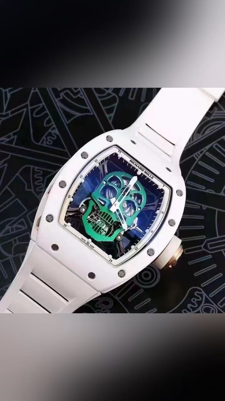 YS Richard Skull Ceramic Case Genuine Tourbillon Skull Series Richard Mille RM52-01 Genuine Tourbillon, reinterpreting the essence of RICHARD MILLE’s skull motif. Overcoming bugs across multiple versions, this allows die-hard fans to own a high-quality replica featuring accurate dimensions, authentic movement, and meticulous detailing.Reasons to Own: 1. Near-identical dimensions: Official: 50*43*16mm; YS Factory: 49.8*44.3*16.4mm;2. Authentic Bearings: The ruby in the skull’s mouth serves as the tourbillon’s genuine bearing, not mere decoration. The gem aligns with the tourbillon’s central axis encased by the upper and lower jaws, evoking the image of swallowing an energy sphere and capturing the sci-fi aesthetic intended by the original design.3. Meticulous Details: The inner left wall of the case cover bears the RM052 stamp identical to the genuine piece. The right eye gear matches the original in size and depth. The central gemstone on the forehead exhibits a vibrant, translucent red hue. Features include a brushed buckle and a rubber strap made from imported Thai material;4. Movement Alignment: Thanks to the tourbillon’s identical position and size to the original, the movement’s operation is clearly visible from the back—below the skull’s occipital region, with the tourbillon’s gemstone-aligned axis in full view. From the front, the black balance wheel is precisely obscured by the skull’s lower jaw, leaving only the escape wheel visible beneath the skull’s base.5. Inner and Outer Excellence: The movement is a custom-made genuine tourbillon caliber from Shanghai Watch Movement Factory. Each watch undergoes rigorous QE timing tests on a high-intensity simulator and features enhanced water resistance. JB Factory—Crafted with Heart and Soul! This is another masterpiece following the Double Tourbillon, RM001, Roger Dubuis Royal, RM053, Rolex Tourbillon, and Classic Fusion!Each YSFactory tourbillon comes with a complimentary genuine leather protective pouch.